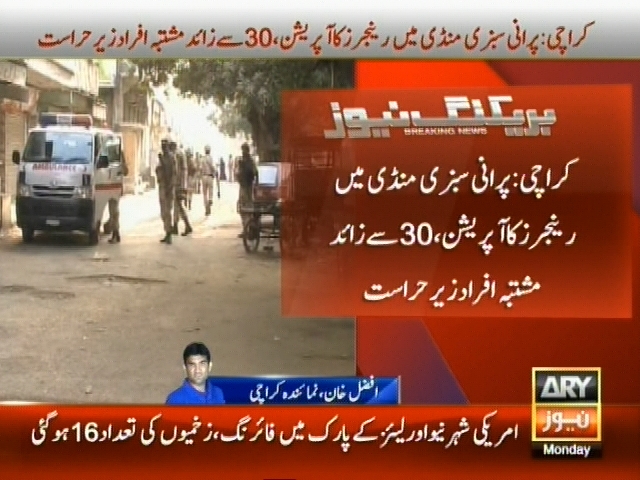 کراچی: پرانی سبزی منڈی میں رینجرز کا آپریشن، 30 سے زائد مشتبہ افراد زیر حراست، آپریشن کے دوران جرائم پیشہ افراد کے ٹھکانوں پر چھاپے مارے جا رہے ہیں۔ ذرائع۔