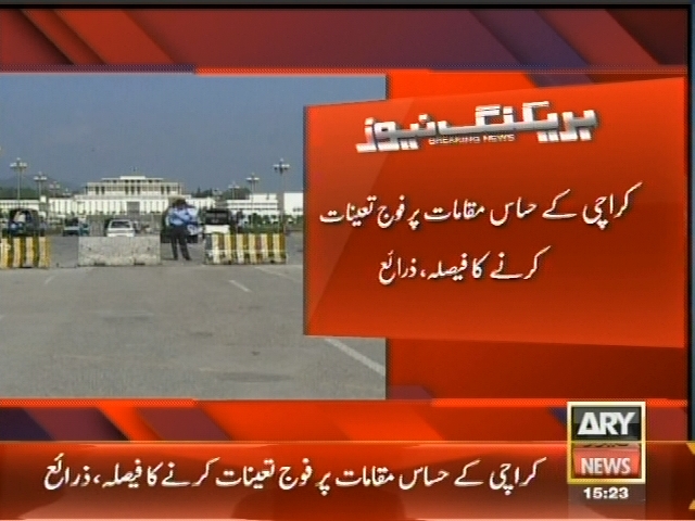 کراچی کے حساس مقامات پر فوج تعینات کرنے کا فیصلہ، آج شام کو پاک فوج کے دستے تعینات کر دیئے جائیں گے۔ ذرائع