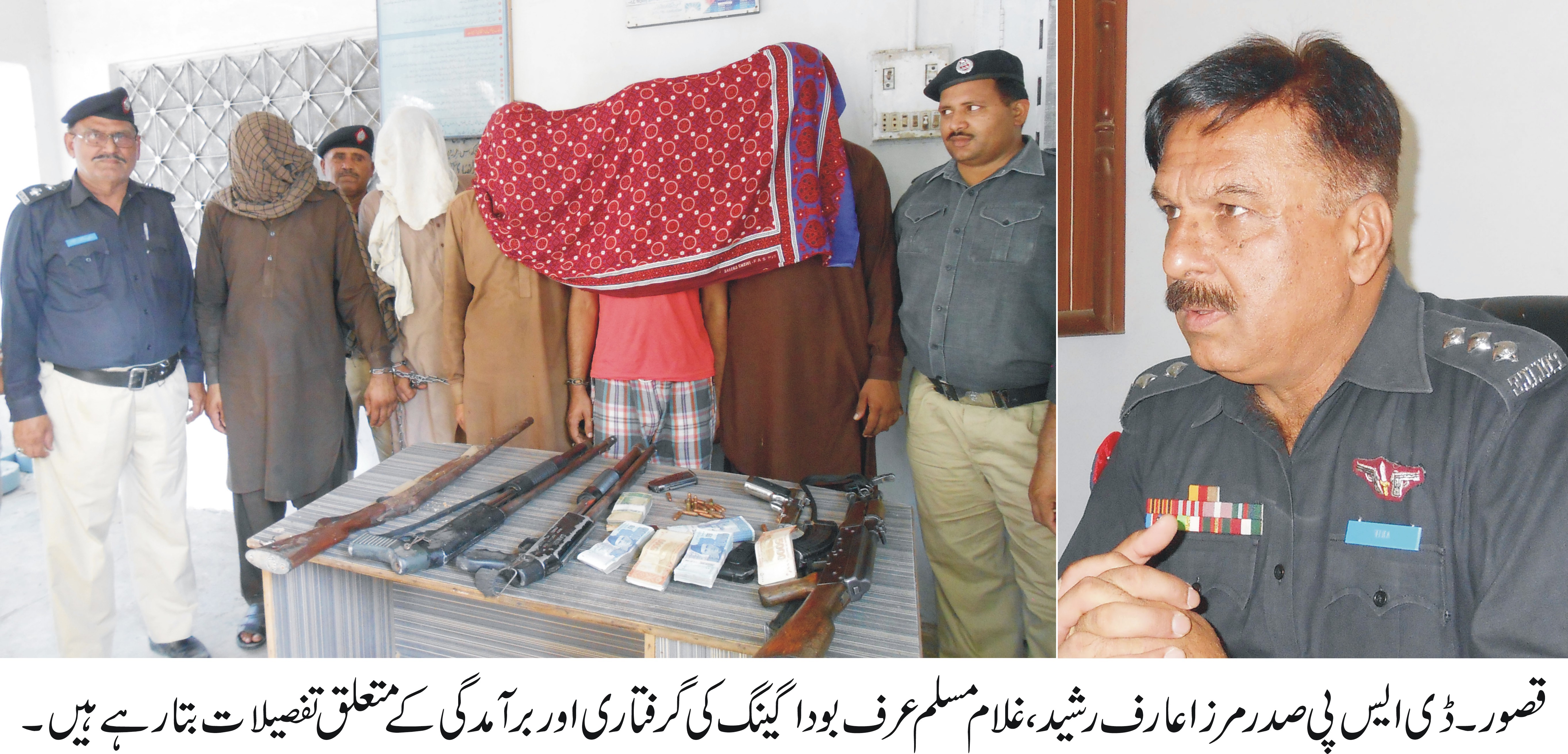 قصور (محمد عمران سلفی سے) تھانہ صدر قصور پولیس نے ڈی پی اوقصور سید علی ناصر رضوی کی خصوصی ہدایات پر ڈکیتی ،رابری اور اسلحہ ناجائز کی متعدد وارداتوں میں ملوث غلام مسلم عرف بودا ڈکیت گینگ کو سرغنہ غلام مسلم عرف بودا اور چار ساتھیوں ارشد،ظفر عرف ظفری ،اختر عباس اور علی نوازسمیت گرفتا ر کرکے ملزمان کے قبضہ سے،پسٹل 2 عدد ، 2 عدد پمپ ایکشن ،بندوق ،نقدی 175000 لاکھ روپے ، 8 عدد موبائل فونز،4بکرے ، 2 جھوٹے،ایل سی ڈی ،ڈی وی ڈی معہ دیگر سامان کل مالیتی 14 لاکھ روپے مالیت کا مال مسروقہ بر آمد کرلیا ہے۔ڈی ایس پی صدر مرزا عارف رشید نے تفصیلا ت بتا تے ہو ئے کہا کہ ملزم غلام مسلم عرف بودا نے اپنے دیگر7کس ساتھیوں پر مشتمل ایک گینگ تشکیل دے رکھا تھا جو رات کے وقت مسلح ہو کر فارمز اور حویلی مال مویشی میں داخل ہوکر ڈکیتی کی واردات کے دوران نقدی ،موبائل فون،مال مویشی اور دیگر قیمتی سامان چھیننے کی وارداتیں کرتے تھے ملزمان نے ضلع قصور میں ایسی وارداتیں کر نے کے بازار گرم کر رکھا تھااور مزاحمت کرنے پر فائر مارنے سے بھی گریز نہ کرتے تھے۔ ملزمان کی گرفتاری کیلئے ڈی پی اوقصور سید علی ناصر رضوی کی خصوصی ہدایات پر زیر نگرانی ایس ایچ او تھانہ صدرقصور انسپکٹر محمد یونس معہ دیگر ملازمان پر مشتمل ایک ٹیم تشکیل دی گئی جنہوں نے اپنی پیشہ وارانہ صلاحیتوں کو بروئے کا رلاتے ہوئے غلام مسلم عرف بودا گینگ کو ساتھیوں سمیت گرفتا کر کے مال مسروقہ اور اسلحہ ناجائز برآمد کرلیا ہے ۔ملزمان کے دیگر ساتھیوں کو بھی ٹریس کیا جا چکاہے جن کو بھی جلد گرفتار کرلیا جائے گا ۔ دوران انٹیروگیشن ملزمان نے انکشاف کیا کہ عرصہ قریب 13/14یوم قبل رائیونڈ روڈ پر واقعہ BNNفارم میں داخل ہوکر نقدی 175000روپے ،موبائل فون ،بکرے ،جھوٹے ،ایل سی ڈی اور دیگر قیمتی سامان چھیننے کی واردات کی تھی اس طرح کی ملزمان نے متعدد وارداتوں کا انکشاف کیا ہے ملزمان سے مزید انٹیر وگیشن ابھی جا ری ہے۔ڈی پی اوقصور سید علی ناصر رضوی نے اچھی کارکردگی پر افسران وملازمان میں نقدانعام اور تعریفی سرٹیفکیٹ کا اعلان کیا ہے۔
