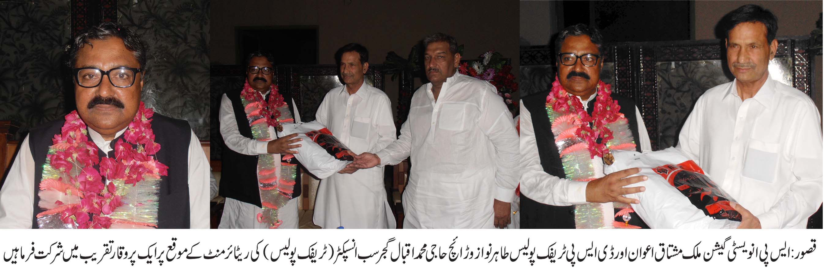 قصور(بیورورپورٹ)مثبت سوچ رکھنے والے ہمیشہ لوگوں کے دلوں پراج کرتے ہیں اوروہ اپنے محکمے میں عزت کی نگاہ سے دیکھے جاتے ہیں کیونکہ وہ ہمیشہ محکمے میں ماتھے کاجھومربن کررہتے ہیں ان خیالات کا اظہار ایس پی انویسٹی گیشن ملک مشتاق اعوان نے حاجی محمد اقبال گجرسب انسپکٹر ٹریفک پولیس کی ریٹائرمنٹ کے موقع پر ایک پروقار تقریب سے خطاب کرتے ہوئے کیا۔اس موقع پر ڈی ایس پی ٹریفک طاہر نوازوڑائچ ،حاجی محمد مشتاق کے علاوہ معززین شہر اورٹریفک پولیس کے جوانوں نے کثیرتعدادمیں شرکت کی ۔حاجی محمداقبال گجرکوایس پی انویسٹی گیشن نے پھولوں کاگدستہ پیش کیا اورڈی ایس پی ٹریفک طاہر نواز وڑائچ نے محکمہ کی طرف سے بہترین ایوارڈ اورشیلڈپیش کی اورحاجی اقبال گجر کی محکمہ ٹریفک پولیس کے لیے کاوشوں کوزبردست الفاظ میں خراج تحسین پیش کیا گیا۔