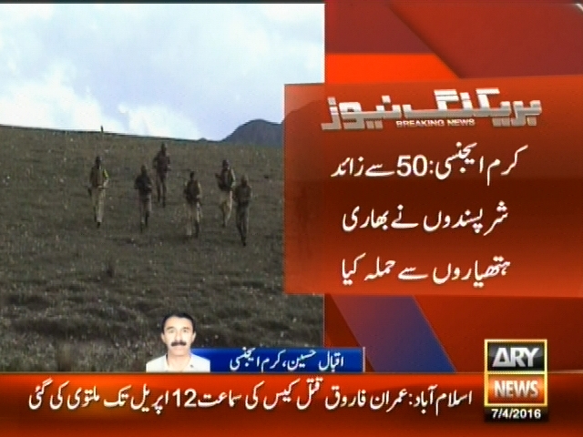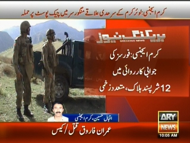 کرم ایجنسی : لوئر کرم کے سرحدی علاقے منگورسر میں چیک پوسٹ پر حملہ، 50 سے زائد شرپسندوں نے بھاری ہتھیاروں سے حملہ کیا، فورسز کی جوابی کارروائی میں 12 شرپسند ہلاک، متعدد زخمی۔