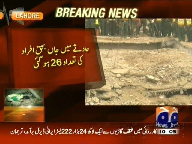 لاہور میں گرنے والی فیکٹری کے ملبے سے ایک اور لاش نکال لی گئی، حادثے میں جاں بحق افراد کی تعداد 26 ہوگئی۔ حادثے کے 46 گھنٹے بعد بھی ملبہ ہٹانے کا کام جاری۔