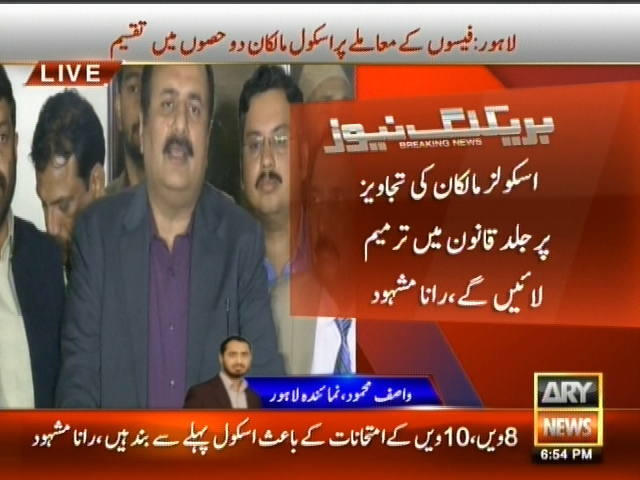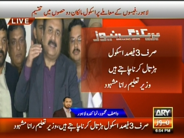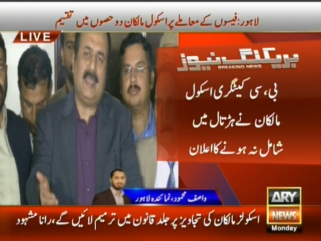 لاہور: فیسوں کا معاملے پر اسکول مالکان دو حصوں میں تقسیم، صرف 3 فیصد اسکول ہڑتال کرنا چاہتے ہیں، بی سی کیٹگری اسکول مالکان نے ہڑتال میں شامل نہ ہونے کا اعلان، وزیر تعلیم رانا مشہود۔
