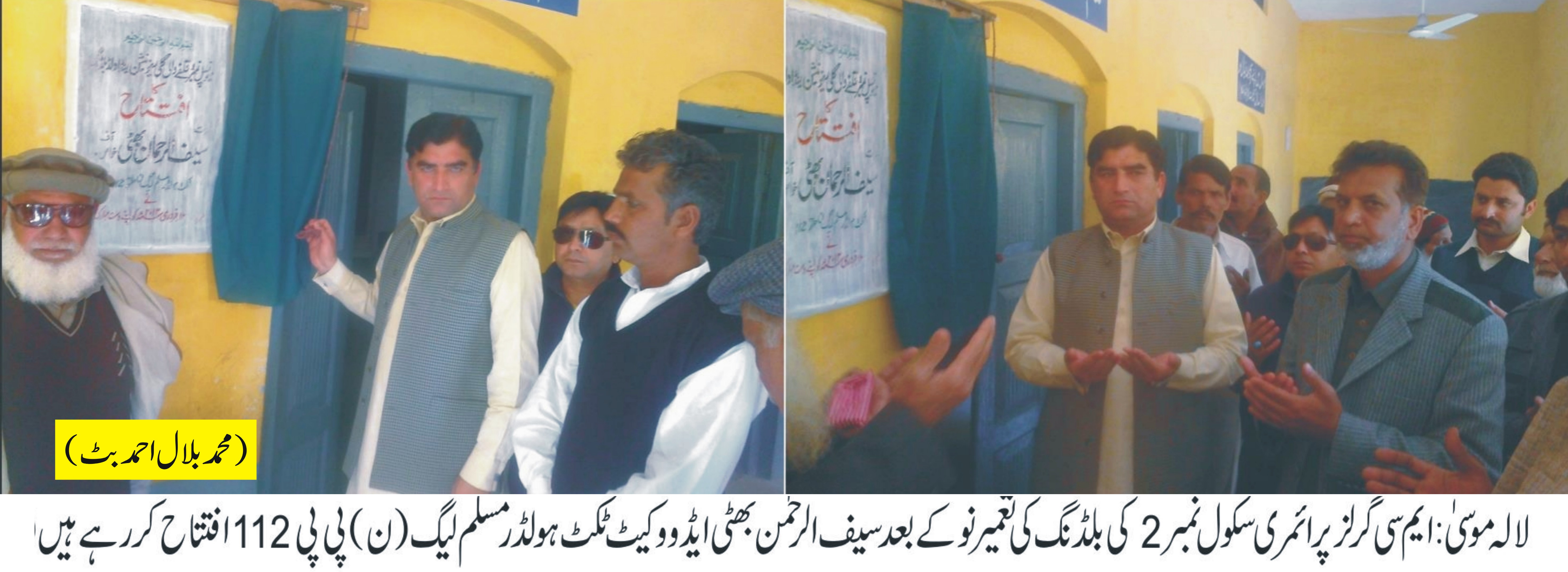 لالہ موسیٰ : ایم سی گرلز پرائمری سکول نمبر 2 کی بلڈنگ کی تعمیر نو کے بعد سیف الرحمٰن بھٹی ایڈوکیٹ ٹکٹ ہولڈر مسلم لیگ ن پی پی 112 افتتاح کر رہے ہیں۔
