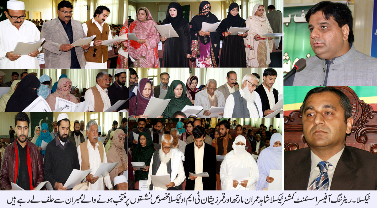 ٹیکسلا (ڈاکٹر سید صابر علی سے) ٹیکسلا میونسپل کمیٹی اور تحصیل ٹیکسلا کی آٹھ یونین کونسلوں میں مخصوص نشستوں پر ہونے والے انتخابات کے نتیجہ میں منتخب ہونے والے 45 کونسلران کی تقریب حلف برداری کمیونٹی ہال ٹیکسلا میں منعقد ہوئی ، ٹیکسلا میونسپل کمیٹی کو نو منتخب ممبران سے ریٹرننگ آفیسر اسسٹنٹ کمشنر ٹیکسلا شاہد عمران مارتھ جبکہ یونین کونسلوں سے منتخب ہونے والے نو منتخب ممبران کا حلف ریٹرننگ آفیسر ٹی ایم او ٹیکسلا قمر زیشان نے لیا،اس موقع پر عمائدین علاقہ کے علاوہ رکن صوبائی اسمبلی حاجی ملک عمر فاروق مسلم لیگ ن کے اراکین ، پی ٹی آئی کے ممبران کی کثیر تعداد موجود تھی،تقریب میں نظامت کے فرائض ای ڈی او عبدا لخالق ادا کر رہے تھے ، تقریب سے خطاب کرتے ہوئے اسسٹنٹ کمشنر ٹیکسلا شاہد عمران مارتھ نے مخصوص نشستوں پر منتخب ہونے والے تمام ممبران کو مبارک باد پیش کرتے ہوئے اس امر کا اظہار کیا کہ منتخب کونسلران عوام کی فلاح و بہبود اور عوامی مسائل کے حل کے لئے اپنا کردار ادا کریں گے انھوں نے کہا کہ خوش آئند امر ہے کہ تمام مراحل انتہائی خوش اسلوبی سے حل ہوئے چئیرمین اور وائس چئیرمین کے انتخاب کا آخری مرحلہ بھی احسن طریقے سے انجام پائے گا جس کے بعد کونسلران کا ہاوس مکمل ہوجائے گا اور وہ اپنی ذمہ داریوں سے نبرد آزما ہونگے، تقریب میں سید شہزادعمران حیدر نقوی ، مسلم لیگ ن تحصیل ٹیکسلا کے صدر فیاض خان تنولی کے علاوہ کونسلران ، شیخ صوفیان مسعود، اللہ دتہ اعوان، ایوب صراف،زیشان صدیق بٹ ، طاہر محمود طاہری،سید محمود حسین شاہ،چئیرمین یوسی گڑھی افغاناں ملک محمد داود،کونسلر ملپور ملک عبدالوحید،ملک نثار ، حاجی عبدالرحمان،قاری غلام مجتبیٰ ،ملک اعظم ودیگر موجود تھے،