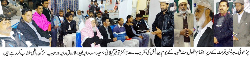 تقریب کا اہتمام لبریشن فرنٹ سٹی چڑھوئی یونٹ نے کیا تھا۔ تقریب کی صدارت تحصیل صدر راجہ مجید نے کی جبکہ مہمانِ خصوصی زونل صدر ڈاکٹر توقیر گیلانی تھے۔تقریب میں ممتاز کشمیری مورخ سعید اسد نے بھی خصوصی شرکت کی۔ سٹیج سیکریٹری کے فرائض حبیب الرحمن ہاشمی نے انجام دیے۔تقریب سے خطاب کرتے ہوئے لبریشن فرنٹ آزاد کشمیر گلگت بلتستان زون کے صدر ڈاکٹر توقیر گیلانی نے کہا کہ مقبول بٹ نے جس دور میں جنم لیا وہ ریاست جموں کشمیر کی تاریخ میں سیاسی انتشار اور افراتفری کا دور تھا۔