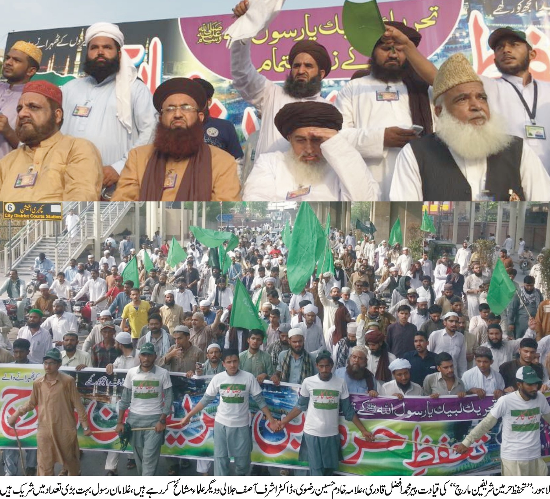 لاہور میں داتا ددربار تا پنجاب اسمبلی عظیم الشان ”تحفظ حرمین شریفین مارچ” کے ہزاروں شرکاء سے خطاب کرتے ہوئے حضرت پیر محمد افضل قادری، شیخ الحدیث حافظ خادم حسین رضوی، ڈاکٹر اشرف آصف جلالی ، علامہ فاروق الحسن قادری، پیر مختار اشرف رضوی و دیگر علماء ومشائخ نے کہا ہے کہ پاکستان ہنگامی بنیادوں پر اسلامی سربراہی کانفرنس بلا کر حرمین شریفین کے تحفظ کیلئے تمام ضروری اقدامات اٹھائے۔
