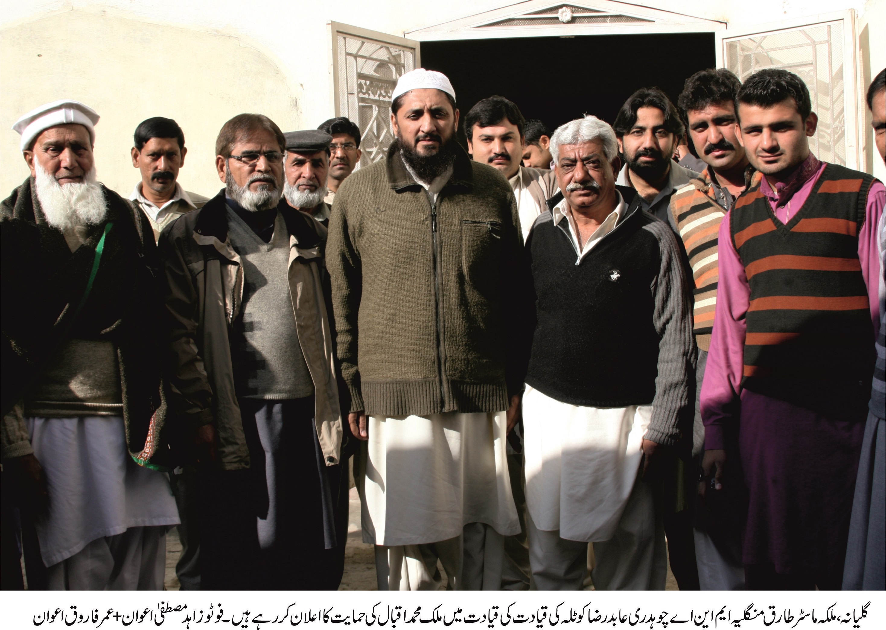 ملک محمد اقبال اعوان نے کہا کہ پاکستان مسلم لیگ ن ہی عوام کو مسائل سے نجات دلائے گی ۔ہم انشاء اللہ منتخب ہو کر یونین کونسل ملکہ کے عوام کی خدمت کریں گے۔ اس موقع پر ملک افتخار احمد اعوان۔ صوبیدار طالب حسین۔ ملک اشفاق بٹر اعوان۔ حافظ ذکاء اللہ۔ مولوی ملک محمد یونس اعوان۔ ملک غلام حیدر ۔زاہد مصطفی اعوان۔ حسن ضیاء اعوان۔ عمر فاروق اعوان۔ملک افضال احمد خاں۔ ملک محسن ضیاء اعوان۔ احسن ضیاء اعوان۔ چوہدری عنصر پلاوڑی اور دوسرے درجنوں افراد بھی موجود تھے۔
