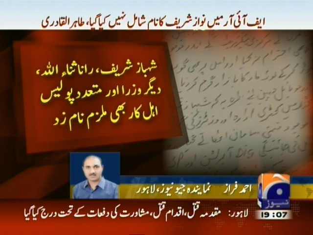 سانحہ ماڈل ٹاؤن کا مقدمہ متاثرہ فریق کی درخواست کے مطابق تھانہ فیصل ٹاؤن میں درج، ایف آئی آر میں وزیراعظم محمد نواز شریف کا نام بطور ملزم درج کر لیا گیا، شہباز شریف، رانا ثناء اللہ دیگر وزرا اور متعدد پولیس اہلکار بھی ملزم نامزد۔