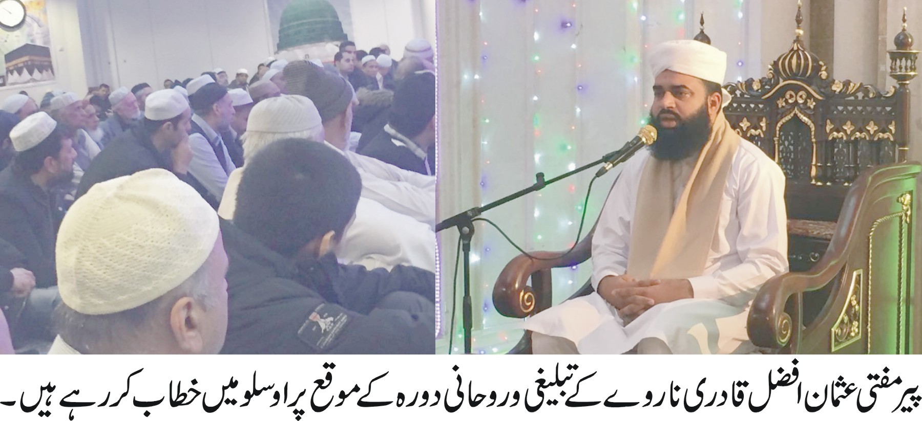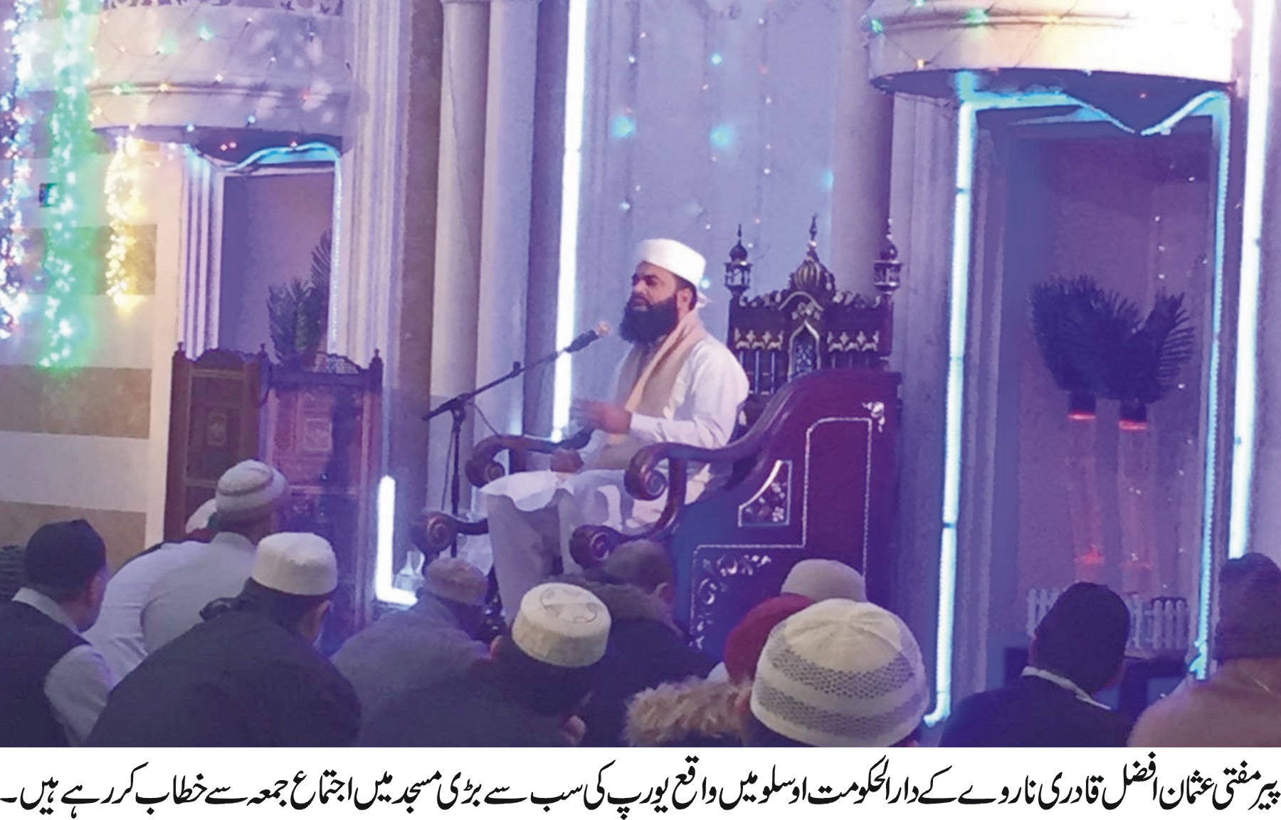 گجرات (پریس ریلیز) پیر مفتی محمد عثمان افضل قادری تبلیغی وروحانی دورہ پر ناروے پہنچ گئے۔ اوسلو ایئر پورٹ پر احباب نے شاندار استقبال کیا۔ یورپ کی سب سے بڑی مسجد ”مرکزی جماعت اہلسنت اوسلو” میں خطاب اور نماز جمعہ کی امامت کی جبکہ ناروے میں منعقدہ مختلف تقاریب میں بھی شرکت کرینگے۔ اوسلو میں خطاب کرتے ہوئے پیر مفتی عثمان افضل قادری نے کہا کہ دین اسلام انسانیت کے احترام اور خیرخواہی کا علمبردار ہے، جس میں انسانیت کے مسائل ومعاملات اور تمام مراحل کا جامع حل اور بہترین رہنمائی موجود ہے۔ انہوں نے کہا کہ مسلم حکمران امت کی بہتری کیلئے اجتماعی تھنک ٹینک تشکیل دیں اور درپیش مسائل کیلئے کردار ادا کریں۔ انہوں نے کہا کہ روح کو غذا اور دلوں کو سکون وچین اللہ کے ذکر سے ہی ملتا ہے لہذا اللہ کے ذکر کو اپنا معمول بنائیں۔ انہوں نے کہا کہ درود پاک ایسا وظیفہ ہے جس سے کراما کاتبین دونوں فرشتے بیک وقت مصروف ہوجاتے ہیں ایک نیکیاں لکھنے میں اور دوسرا گناہ مٹانے میں لہذا درود پاک کی کثرت کرکے خالق کائنات کی سنت پر عمل کریں۔پیر مفتی عثمان افضل قادری نے مزید کہا کہ امت کو دینی تعلیم کے حصول اور عمل صالح پر خاص توجہ دینا ہوگی پھر ہی فلاح دارین ممکن ہے۔ انہوں نے کہا کہ مسلمان جدید ٹیکنالوجی اور جدید علوم میں مہارت حاصل کریں۔ غیر مسلموں کے طرف سے صداقت قرآن مجید پر عقلی دلیل پوچھنے پر انہوں نے کئی جواب دیئے جن میں سے ایک یہ ہے کہ سائنس اب بتا رہی ہے کہ اس کائنات میں مختلف سیارے اور ان پر مشتمل بے شمار کہکشائیں ہیں جبکہ قرآن مجید کے ابتدائی کلمات ”الحمد للہ رب العالمین” میں جمع کا صیغہ استعمال کرکے یہی راز چودہ سو سال پہلے بیان کر دیا گیا کہ جہاں ایک نہیں بلکہ بے شمار ہیں اور ان سب کا خالق اللہ رب ذوالجلال ہے۔