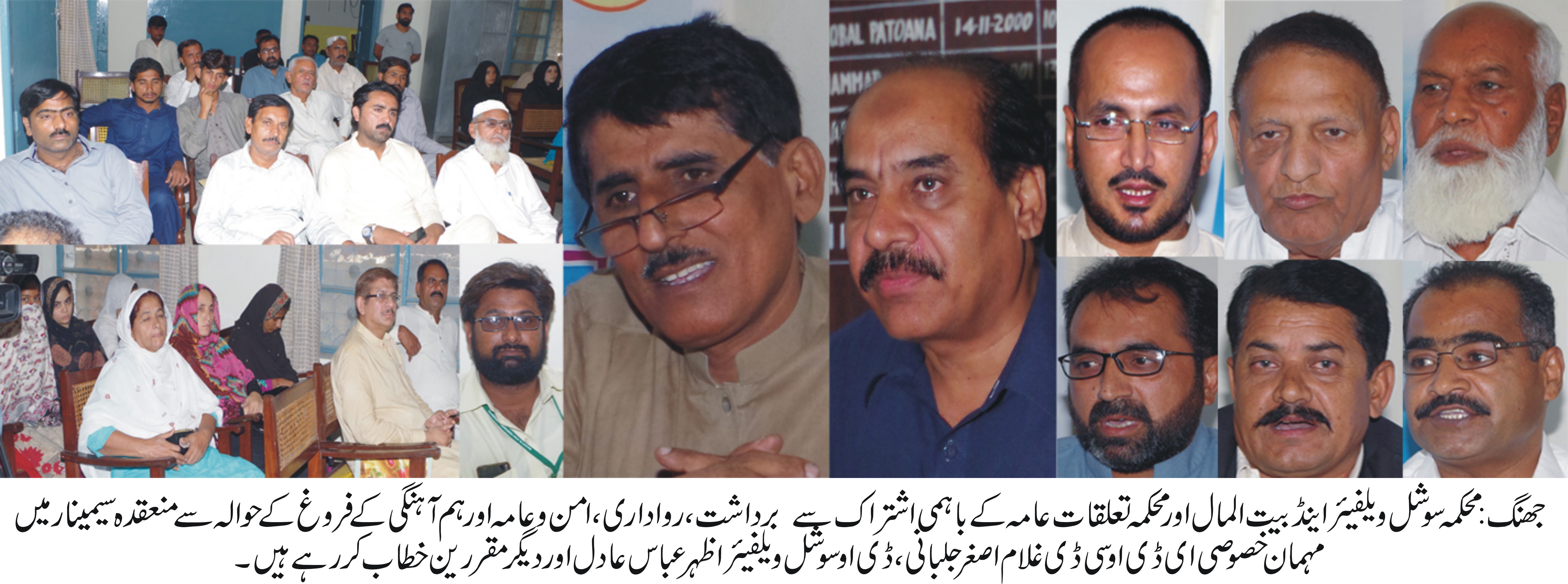 جھنگ (ڈسٹرکٹ رپورٹر) برداشت ، رواداری ، امن و عامہ اور ہم آہنگی کے فروغ کے حوالہ سے محکمہ سوشل ویلفیئراینڈ بیت المال اورمحکمہ تعلقات عامہ کے باہمی اشتراک سے سوشل ویلفیئر کمپلیکس میں ایک خصوصی سیمینار کا انعقاد کیا گیا۔اس موقع پر ایگزیکٹیو دسٹرکٹ آفیسر کمیونٹی ڈویلپمنٹ غلام اصغر جلبانی، ڈسٹرکٹ آفیسر سوشل ویلفیئر اظہر عباس عادل ،محکمہ تعلقات عامہ کے ضلعی آفس کاعملہ ، سپیشل ایجوکیشن ، پالولیشن ڈیپارٹمنٹ،چیئر مین بیت المال کمیٹی ریاض حسین عشرت،صدرآمنہ ویلفیئر فائونڈیشن ڈاکٹر ریاض نول،سی پی ڈی آئی سے فیصل منظور، اور دیگر مختلف سماجی تنظیموں کے مردوخواتین اراکین، عوامی نمائندگان ، اساتذہ اور طلباء و طالبات سمیت مکاتب فکر کے علمائے کرام ،عمائدین اورمختلف شعبہ ہائے زندگی سے تعلق رکھنے والے افراد نے کثیر تعداد میں شرکت کی ۔حکومت پنجاب کی ہدایات کی روشنی میں برداشت ، رواداری ، امن و عامہ اور ہم آہنگی کے فروغ کی اہمیت کو اجاگر کرنے کیلئے منعقدہ سیمینار کے مہمان خصوصی ای ڈی او سی ڈی غلام اصغر جلبانی نے اپنے خطاب کے دوران کہا کہ ہر مذہب اور ثقافت کا سب سے پہلا اور اہم ترین سنہری اصول برداشت ،امن، ہم آہنگی اور رواداری کی تعلیم ہے جو زندگی کی ہر سطح پرانتہائی ضروری ہے۔انہوںنے کہا کہ اس وقت ہمارا ملک پاکستان دہشتگردی کی لپیٹ میں ہے جس کیلئے بھائی چارے کی مثالی فضاکو بحال رکھتے ہوئے مستقل اوردیرپا امن و عامہ کیلئے تمام مکاتب فکر کے علمائے کرام ،عمائدین کو ایک پلیٹ فارم پر یکجا ہونا ہوگا۔ڈی او سوشل ویلفیئر اظہر عباس عادل نے کہا کہ اسلام بنیادی طور پر امن کا مذہب ہے۔ امن اور رواداری کے ذریعے ملکوں، قوموں اور فرقوں کے درمیان ہم آہنگی کو بہت آسانی سے حاصل کیا جا سکتا۔انہوںنے کہا کہ بدامنی کی وجہ سے پاکستان تنہا ہوتا جا رہا ہے لہٰذا ضرورت اس امر کی ہے کہ امن ، برداشت اور رواداری کے قیام سے ہی پاکستان خوشحال، ترقی یافتہ اور مستحکم ہو سکتا ہے۔ڈاکٹرریاض نول، فیصل منظور،حاجی لطیف ، غلام دستگیر، قیصر عباس شاہ اور دیگر مقررین نے برداشت ، رواداری ، امن و عامہ اور ہم آہنگی کے فروغ کے حوالہ سے خطاب کرتے ہوئے کہا کہ ہمارا دین اسلام اور ہمارا آئین محبت کا درس دیتاہے اور انصاف کی تلقین کرتاہے۔انہوںنے کہا کہ محرم الحرام کے دوران اخوت ، رواداری ، تحمل مزاجی، نرمی اور ایثار قربانی کا مظاہرہ کرتے ہوئے مثالی فضا قائم کریں کیونکہ شہدائے کربلا کی قربانی کے عوض ہی یہ اسلام ہم تک پہنچا ہے۔مقررین نے مزیدکہا کہ اقوام متحدہ مہلک ہتھیاروں اور جنگی صورتحال پیدا کرنے والے ممالک کی حوصلہ شکنی کریں جیسا کہ نیشل ایکشن پروگرام کے تحت ملک میں دہشگردی اوربد امنی پھیلانے والے عناصر کا قلع قمع کیا جا رہا ہے اسی طرح ہر شعبہ ہائے زندگی سے تعلق رکھنے والے افراد اپنے دائرہ کار کے اندر امن و عامہ کے فروغ اور بحالی کیلئے اپنا کردار ادار کرتے رہیںتاکہ آئندہ نسلیں پرامن ماحول میں بہتر زندگی بسر کر سکیں۔بعد ازاں ملکی ترقی ،سلامتی ، امن و عامہ ،اور استحکام کیلئے دعاء مانگی گئی اور عہد کیا گیا کہ ہم سب ملکر ملک پاکستان کے امن وعامہ کے قیام کیلئے یکجا ہوکر اپنا موثر اور فعال کردار ادا کریں گے۔