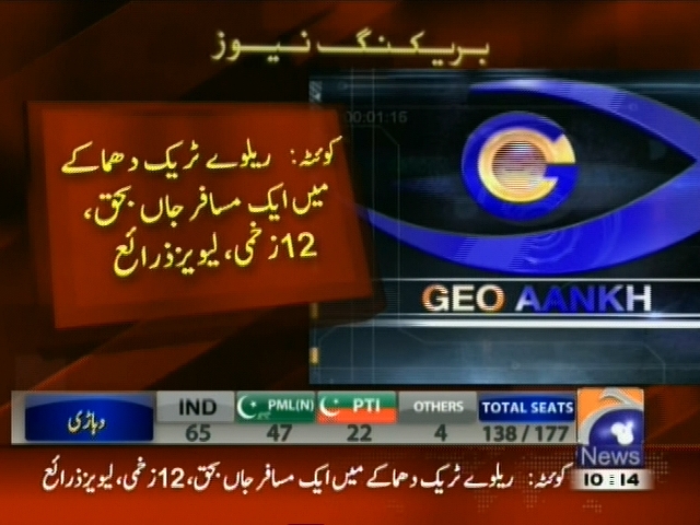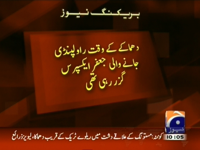مستونگ کے علاقے دشت میں ریلوے ٹریک کے قریب دھماکہ، ریلوے ٹریک دھماکے کے میں ایک مسافر جاں بحق، 12 زخمی، لیویز ذرائع، دھماکے کے وقت راولپنڈی جانے والی جعفر ایکسپریس گزر رہی تھی۔