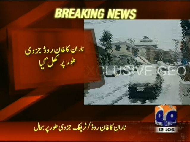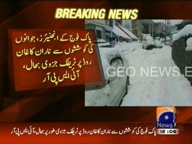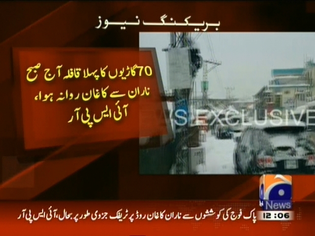 ناران کاغان روڈ جزوی طور پر کھل گیا، پاک فوج کے انجنیئرز جوانوں کی کوششوں سے ناران کاغان روڈ پر ٹریفک جزوی بحال، 70 گاڑیوں کا پہلا قافلہ آج صبح ناران سے کاغان روانہ ہوا، آئی ایس پی آر۔