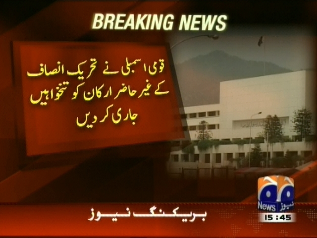 قومی اسمبلی نے تحریک انصاف کے غیر حاضر ارکان کو تنخواہیں جاری کر دیں، تحریک انصاف کے ارکان کو مجموعی طور پر 2 کروڑ روپے ادا کیے گئے ہیں، ہر رکن کو انفرادی طور پر تقریبا 8 لاکھ روپے ادا کیے گئے۔