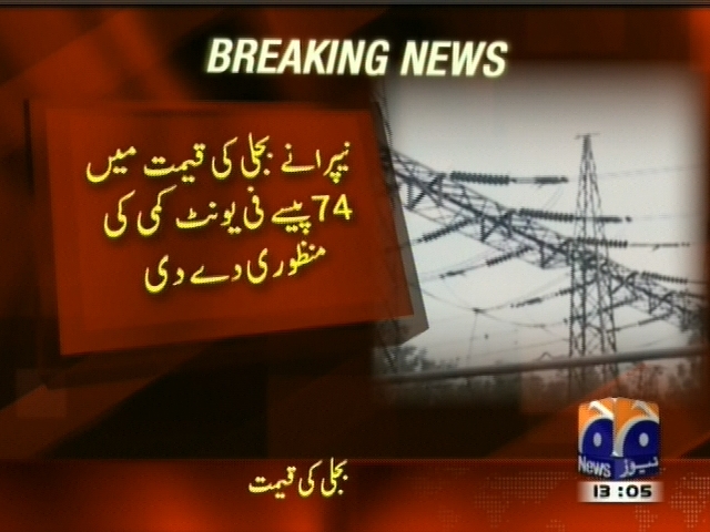 نیپرا نے بجلی کی قیمت میں 74 پیسے فی یونٹ کمی کی منظوری دے دی، بجلی کی قیمت میں کمی اکتوبر کی ماہانہ فیول ایڈجسٹمنٹ کی مد میں دی گئی۔