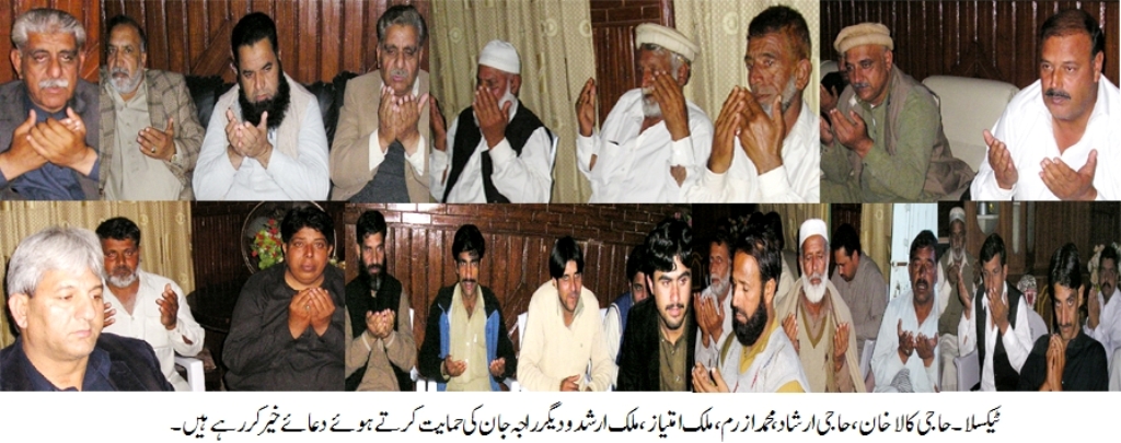 ٹیکسلا (ڈاکٹر سید صابر علی) امیدوار برائے چئیرمین یونین کونسل سرائے خربوزہ راجہ محمد جان نے کہا ہے کہ عوام کی فلاح بہبود ،علاقہ کی محرومیوں کا ازالہ اور عوام کو بنیادی ضرورت زندگی کی بلا تفریق فراہمی ہماری ائولین ترجیحات ہیں، پہلے بھی عوام کی بلا تفریق خدمت کی اور آئندہ بھی یہ نیک عمل جاری رکھیں گے، ملک امیتاز نے کہا کہ محلہ ارشد ڈھوک پراچہ کے تمام مسائل میں خود حل کرونگا ،اہلیان یونین کونسل سرائے خربوزہ کے لئے یہ خوشی کا مقام ہے کہ دو ماہ کے اندر دوسری مرتبہ اتخابی عمل ہو رہا ہے انشااللہ سب ملکر نہ صرف راجہ محمد جان کو اللہ تعالیٰ کے فضل و کرم سے کامیاب کرائیں گے بلکہ علاقہ کے مسائل بھی حل ہونگے، ان خیالات کا اظہار انھوں نے محلہ ارشد ڈھوک پراچہ یونین کونسل سرائے خربوزہ میں ملک ارشد، حاجی کالا خان ،حاجی ارشادکی رہائش گاہ پر منعقدہ انتخابی مہم کے سلسلے میں تقریب سے خطاب کے دوران کیا اس موقع پر سابق امیدوار برائے چئیرمین ملک امتیاز، حاجی کالا خان،حاجی ارشاد، محمد ازرم، ملک شبیر، ملک ارشد، نوزش حسین، ملک راشد، راجہ صادق ایڈووکیٹ،نجیب عباسی،ملک مسلم، ریاض ملک ناظم، عاطف، حمید، راجہ انور، ملک انور، ضیاء عباسی، جواد عباسی، گلستان عباسی، باسط عباسی، باریز خان، کے علاوہ معززین علاقہ کی کثیر تعداد موجود تھی، تقریب میں حاجی کالاخان، حاجی ارشاد اور سابق امیدوار برائے کونسلر ملک ارشد نے راجہ محمد جان کی بھر پورحمایت کا اعلان کیا ،جبکہ ابرار عباسی نے کہا کہ مسجد والی گلی میں خود بنوا کر دونگا، دیگر کام ملک امتیاز نے کرانے کی ذمہ داری اٹھائی ،راجہ جان نے کہا کہ آپ لوگوں نے جو بھی ڈیوٹی لگائی اسے پورا کریں گے ترقیاتی کاموں کی ابتدایہاں سے ہو گی۔
