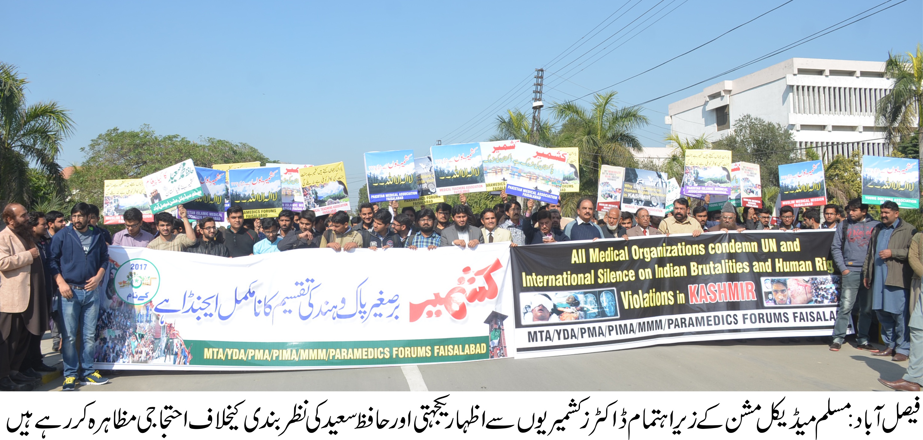 میڈیا میں آئے روز کسی نہ کسی ہسپتال کے باہربیٹے کی لاش پر روتاباپ ،دکھیاری ماں کی آغوش میں نومولودکا تڑپتالاشا ، بیٹے کی گود میں سررکھے مجبورماں کی تصویریں دیکھنے کو ملتی ہیں ،اس میں جتنا ڈاکٹروں ودیگر سٹاف کا قصور ہے وہیں انتظامیہ وارباب اختیار کا بھی قصور ہے جن کی ناقص حکمت عملی کی وجہ سے دل کو زخم دینے والے واقعات وقوع پذیر ہوتے ہیں بلکہ ڈاکٹرز وسٹاف سے زیادہ انتظامیہ وارباب اختیار کا زیادہ قصورہوتا ہے۔ان سب کے باوجودمیڈیکل فیلڈ میں انسانیت نہ صرف موجود ہے بلکہ وہ کشمیریوں کا دردرکھنے کے ساتھ ساتھ اس کا والہانہ وار اظہار بھی کرتے ہیں ۔ جس کی مثال مجھے مسلم میڈیکل مشن کی طرف سے مظلوم کشمیریوں سے اظہار یکجہتی کے لئے مظاہرہ کے دوران دیکھنے کو ملی ۔ الائیڈ ہسپتال کے سامنے زبردست احتجاجی مظاہرے میں مختلف ہسپتالوں کے ڈاکٹرز، پروفیسرز اور میڈیکل شعبہ سے وابستہ طلباء نے شرکت کی۔ مظاہرہ میں شریک ڈاکٹرز نے مقبوضہ کشمیر میں بھارتی مظالم اور حافظ محمد سعید کی نظربندی کیخلاف اردو اور انگریزی میں لکھی گئی تحریروں پر مبنی کتبے اور بینرز اٹھا رکھے تھے جن پر کشمیریوں سے رشتہ کیا لاالہ الااللہ، پیلٹ متاثرہ کشمیریوں کے علاج معالجہ کی اجازت دی جائے اورحافظ محمد سعید کی نظربندی نامنظور، نامنظور جیسی تحریریں درج تھیں۔ اس موقع پر مسلم میڈیکل مشن کے چیف کوآرڈینیٹر ڈاکٹر ناصر ہمدانی، ڈاکٹر سلطان محمود صدر میڈیکل ٹیچرز ایسوسی ایشن،ڈاکٹر معروف وائنس صدر ینگ ڈاکٹرز ایسوسی ایشن پنجاب، ڈاکٹر رائے عارف صدر پاکستان میڈیکل ایسوسی ایشن،ڈاکٹر عبدالستار قریشی پاکستان اسلامک میڈیکل ایسوسی ایشن ،حلیم خان نیازی صدر ینگ ڈاکٹرزایسوسی ایشن پنجاب ،پروفیسر ڈاکٹر طفیل محمد، ڈاکٹر جاوید اقبال،ڈاکٹرمحمد الیاس و دیگر نے خطاب کیا اور کہاکہ بھارتی فوج نے مقبوضہ کشمیر میں ظلم و بربریت کی انتہا کر رکھی ہے۔رتی فوج ایمبولینسوں سے زخمیوں کو اتار کر انہیں وحشیانہ بربریت کا نشانہ بناتی ہے ۔ یہ ساری ویڈیوز اور تصویریں دنیا بھر کا میڈیا نشرکررہا ہے لیکن کسی کے کانوں پر جوں تک نہیں رینگ رہی۔ انہوں نے کہاکہ جماعۃالدعوۃ کے سربراہ حافظ محمد سعید نے بھارتی ریاستی دہشت گردی کے خلاف مضبوط آواز بلند کی اور سال 2017ء کو کشمیر کے نام کرتے ہوئے ملک بھر میں ڈاکٹرز، تاجروں، طلباء اور دیگر شعبہ جات سے وابستہ افراد کے پروگراموں کا انعقاد کیا تو بھارتی میڈیا نے آسمان سر پر اٹھا لیا اور پھر مودی سرکار کے دباؤ پر انہیں نظربند کر دیا گیا ہے۔