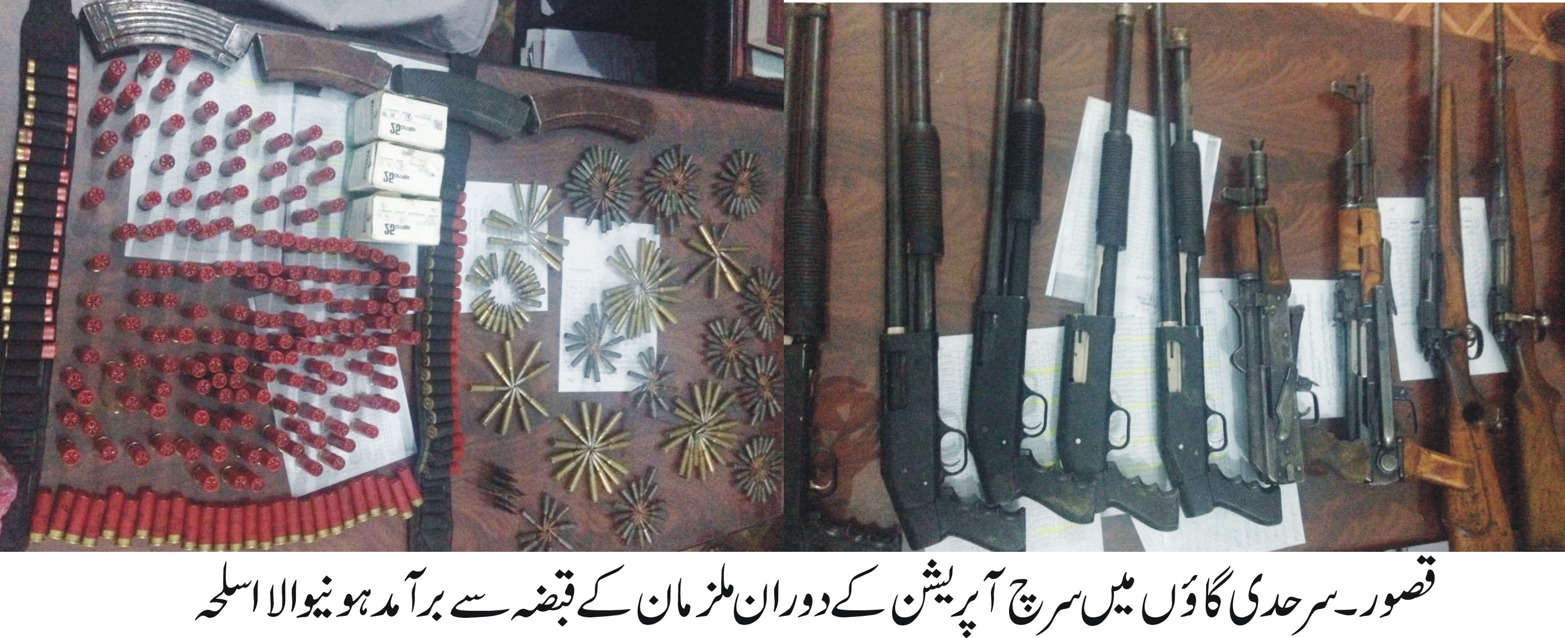 قصور(محمد عمران سلفی سے)نیشنل ایکشن پلان کے تحت پولیس نے گزشتہ روز حساس اداروں کے ساتھ مشترکہ طور پر گنڈاسنگھ کے سرحدی گائوں نگر میں سرچ آپریشن کیا ۔03 افراد کو گرفتار کر کے بھاری تعداد میں جدید اسلحہ ناجائز برآمد کرکے مقدمات درج کرلیے گئے ہیں جبکہ سینکڑوں افراد سے پوچھ گچھ بھی کی گئی ۔ تفصیلات کے مطابق ڈی پی اوقصور سید علی ناصر رضوی کی خصوصی ہدایات پر نیشنل ایکشن پلان کے تحت پولیس اور حساس اداروں نے مشترکہ طور پر گزشتہ روز سرحدی گائوں نگر میں انفارمیشن بیسڈ سر چ آپریشن کیا گیا جس میں2ایس ایچ اوز،ایلیٹ ٹیم کے علاوہ پولیس کی بھاری نفری نے حساس اداروں کے ساتھ مشترکہ طور پر سرچ آپریشن میں حصہ لیاسرچ آپریشن کے دوران 45 کے قریب گھروں کو چیک کیا گیا سینکڑوںافرادسے پوچھ گچھ کی گئی جبکہ تین افراد کو گرفتار کر کے ملزمان کے قبضہ سے5پمپ ایکشن،3رائفل 7MM،2رائفل 44بور اور کثیر تعداد میں گولیا ںو کارتوس برآمد کیے گئے ہیں۔