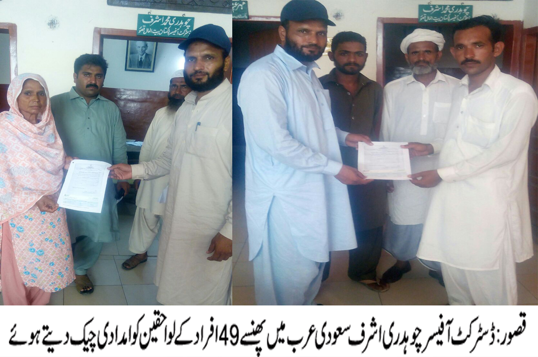 قصور(محمد عمران سلفی سے)پاکستان بیت المال ضلع قصور کی طرف سے سعودی عرب میں کام کرنے والے تنخواہوں سے محروم ضلع بھر کے 49افراد کے لواحقین میں 50,50ہزار کے چیک تقسیم کر دیے گے اس سلسلہ میں ایم ڈی پاکستان بیت المال بیرسٹرعابد وحید شیخ کی ہدائت پر ڈسٹرکٹ آفیسر بیت المال قصور چو ہدری محمد اشرف نے 49 افراد کے لواحقین میں 50,50ہزار کے تقسیم کرتے ہوئے کہاکہ حکومت پاکستان نے سعودی عرب میں کام کے دوران جو مسائل کا شکار ہوئے ہیں اُن کے لواحقین کے ساتھ اظہار ہمدردی کرتے ہوئے یہ امداد جاری کی ہے تاکہ یہ لوگ بھی کسی کے آگے ہاتھ نہ پھیلائیں اور باعزت اپنی روٹی کھا سکیں اُنھوں نے مزید بتایا کہ پاکستان بھر کے تقریبا آٹھ ہزار افراد جو سعودی عرب میں کام کر رہے ہیں اُ ن کے لواحقین کو امداد دی جا رہی ہے 50,50ہزار کے چیک وصول کرنے والوں میںضلع قصور کے ناظم علی ،بشریٰ خانم ،زبیدہ بی بی ،محمد ذولفقار ،خادم حسین و دیگر شامل تھے۔