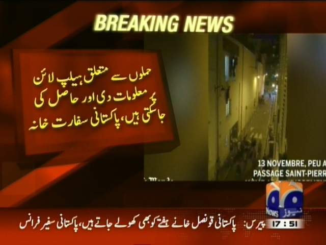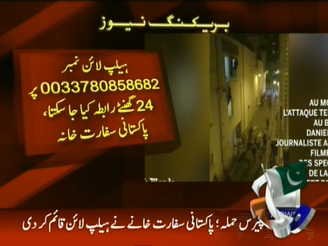 پیرس حملہ، پاکستانی سفارتخانے نے ہیلپ لائن قائم کر دی، حملوں سے متعلق ہیپ لائن پر معلومات دی اور حاصل کی جا سکتی ہیں، ہیلپ لائن نمبر 0033780858682 پر 24 گھنٹے رابطہ کیا جاسکتا ہے، پاکستانی سفارت خانہ۔
