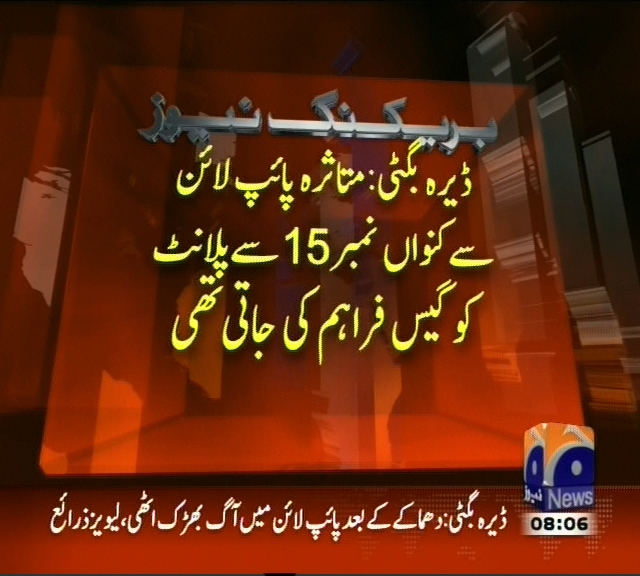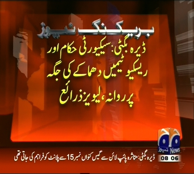 ڈیرہ بگٹی : پیرکوہ گیس فیلڈ کی 8 انچ قطر گیس پائپ لائن دھماکے سے تباہ، متاثرہ پائپ لائن سے کنواں نمبر 15 سے پلانٹ کو گیس فراہم کی جاتی تھی، سیکیورٹی حکام اور ریسکیو ٹیمیں دھماکے کی جگہ پر روانہ، لیویز ذرائع۔