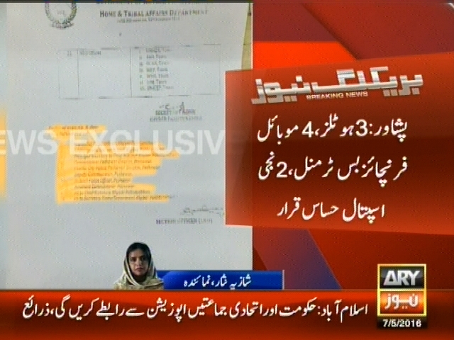 پشاور: محکمہ داخلہ نے پشاور کے کئی اہم مقامات کو حساس قرار دیدیا، پشاور: 3 ہوٹلز، 4 موبائل فرنچائز بس ٹرمنل 2 نجی اسپتال حساس قرار۔