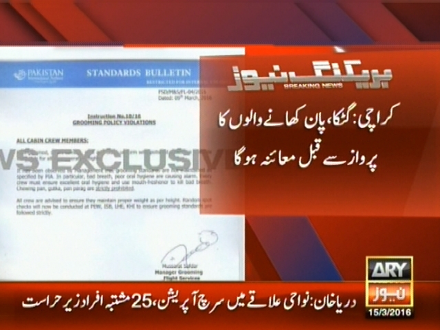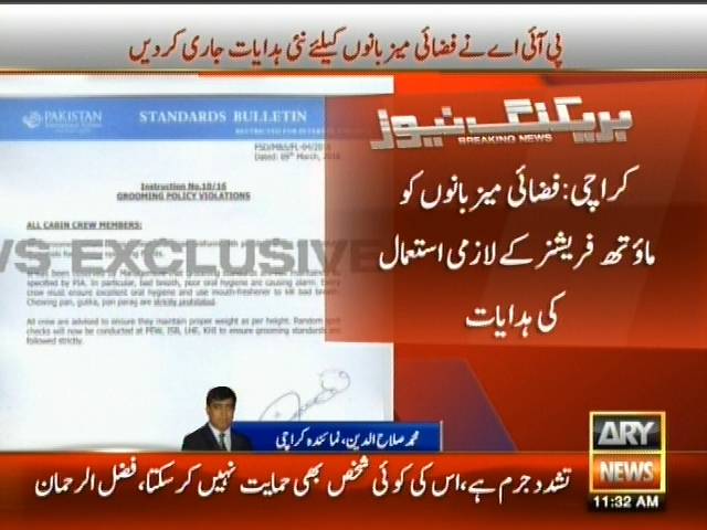 پی آئی اے نے فضائی میزبانوں کیلئے نئی ہدایات جاری کردیں، کراچی: گٹکا،پان کھانے والوں کا پرواز سے قبل معائنہ ہوگا کراچی: فضائی میز بانوں کو ماوتھ فریشنز کے لازمی استمعال کی ہدایات۔