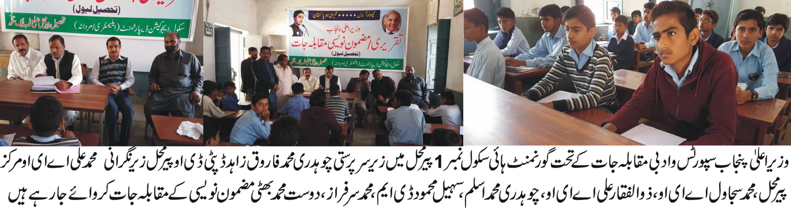 پیرمحل ( نامہ نگار) وزیر اعلیٰ پنجاب سپورٹس وادبی ایلیمنٹری سکول مقابلے اردونویسی کے مقابلہ جات میں محمد فرقان نے اول، محمدفرقان الدین نے دوسری پوزیشن حاصل کرلی تفصیل کے مطابق وزیر اعلیٰ پنجاب سپورٹس وادبی مقابلہ جات کے تحت گورنمنٹ ہائی سکول نمبر1پیرمحل میں زیر سرپرستی چوہدری محمد فاروق زاہد ڈپٹی ڈی او پیرمحل ز یر نگرانی محمد علی اے ای او مرکز پیرمحل ، محمد سجاول اے ای او، ذوالفقار علی اے ای ا و، چوہدری محمد اسلم ، سہیل محمود ڈی ایم ، محمد سرفراز ، دوست محمد بھٹی منعقد کروائے گئے جس میں تحصیل بھر کے 18 سکولوںکے طلبہ نے شرکت کی نتائج کے مطابق محمد فرقان ولد منیر احمد سعیدگورنمنٹ ہائی سکول نمبر1پیرمحل نے اول اردومضمون نویسی ، محمدفرقان الدین ولد محمد دین گورنمنٹ ہائی سکو ل چک نمبر689/31گ ب نے دوسری پوزیشن حاصل کی ، تیسری پوزیشن دبیر عابد ولد عابد حسین اسلامک آکسفورڈ سندھلیانوالی انگریزی مضمون نویسی جمعہ خان ولد گل خان گورنمنٹ ایلمنٹری سکول چک673/14، اول جبکہ محمد نوید ولد محمد رمضان گورنمنٹ ایلمنٹری سکول چک319گ ب نے دوسری جبکہ مومن عباس ولد غلام عباس گورنمنٹ ایلمنٹری سکول بیس رفیقی نے تیسری پوزیشن حاصل کی