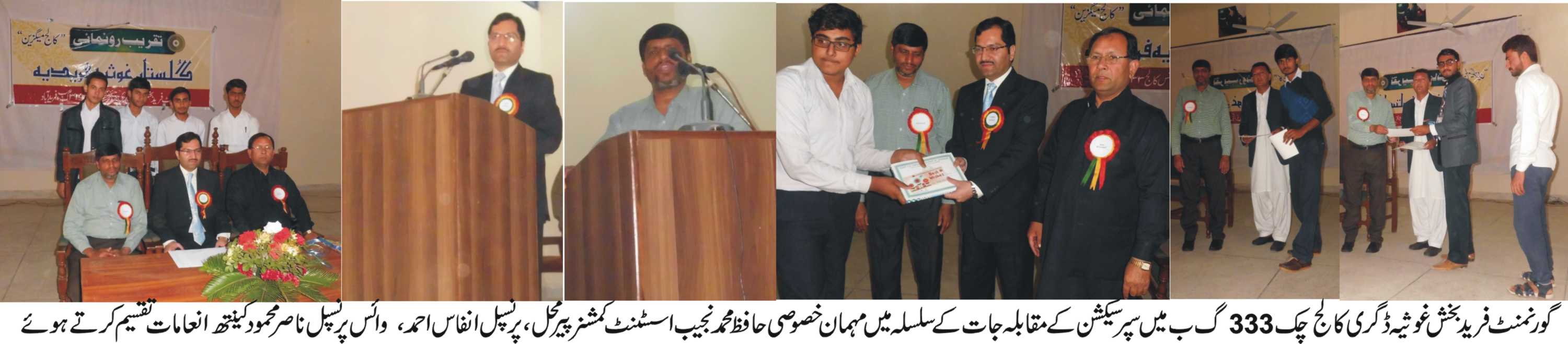 پیرمحل (نامہ نگار) تقریب تقسیم ٹیلنٹ ایوارڈ سپر سیکشن کا انعقاد بہترین کارکردگی کے حامل طلبہ میں لیپ ٹاپ اور کیش پرائز کی تقسیم تفصیل کے مطابق گورنمنٹ فرید بخش غوثیہ ڈگری کالج چک333گ ب میں سپرسیکشن کے مقابلہ جات کے سلسلہ میں فرسٹ ایئر اور سیکنڈایئر کے طلبہ میں سپر سیکشن کامقابلہ جات کی تقریب منعقد ہوئی جس کے مہمان خصوصی حافظ محمد نجیب اسسٹنٹ کمشنر پیرمحل تھے جبکہ مہمان اعزاز پرنسپل انفاس احمد ، ناصر محمود کینتھ تھے تقریب میں مہمان خصوصی حافظ محمد نجیب اسسٹنٹ کمشنر پیرمحل نے بورڈ آف انٹرمیڈیٹ فیصل آباد میں بہترین کارکردگی کے حامل طلبہ کو کیش پرائز اور اسناد اور لیپ ٹیپ تقسیم کیے علاوہ ازیں فورتھ ایئر کلاس کے بہترین طلبہ کو پیف کی طرف سے وظائف کی تقسیم کی گئی