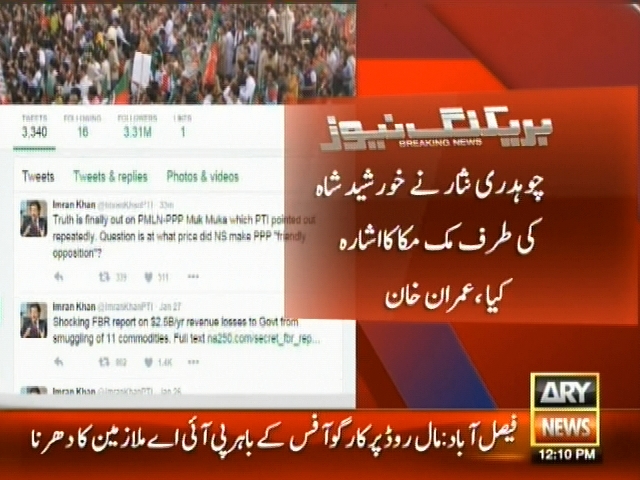 ن لیگ اور پیپلز پارٹی کی حقیقت سامنے آگئی عمران خان، چوہدری نثار نے خورشید شاہ کی طرف مک مکا کا اشارہ کیا، عمران خان، نواز شریف نے کس قیمت پر پیپلز پارٹی کو فریںڈ لی اپوزیشن بنایا عمران خان۔