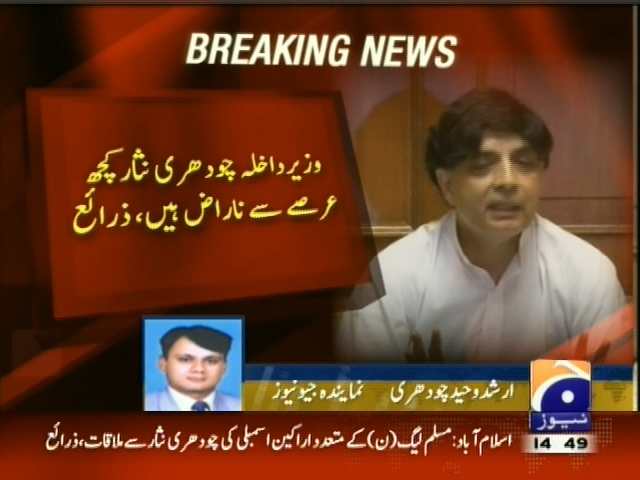 اسلام آباد: مسلم لیگ ن کے متعدد اراکین اسمبلی کی چوہدری نثار سے ملاقات، وزیر داخلہ چوہدری نثار کچھ عرصے سے ناراض ہیں، ذرائع