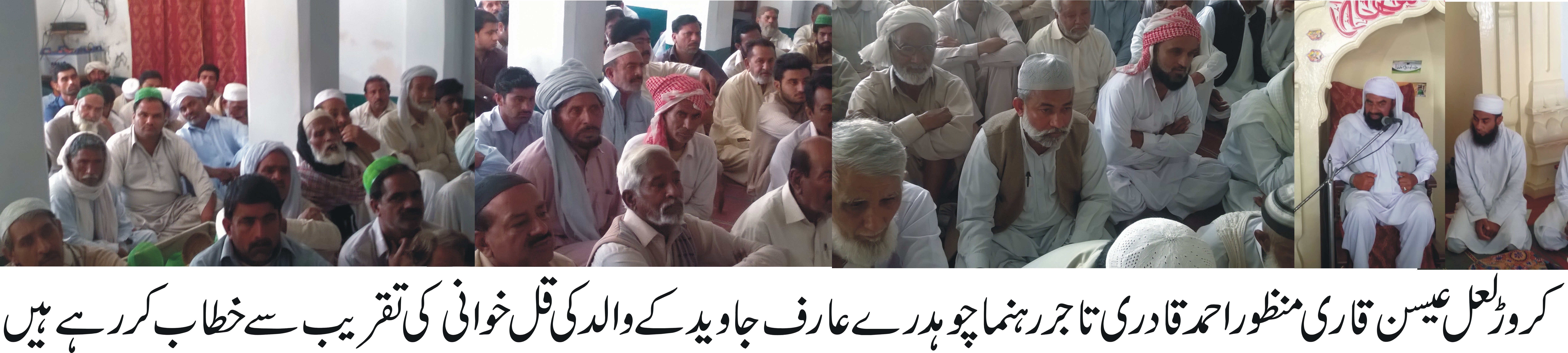ٍکروڑلعل عیسن (نامہ نگار) موت بر حق ہے جس کا مزا ہر ذی روح نے چھکنا ہے والدین بڑٰ نعمت ہیں جن کی خدمت اولاد پر فرض ہے والدین کا نا فرمان جہنمی ہے انہوں نے کہا کہ جہاں اللہ تعالیٰ نے نماز روزہ ،حج ،زکوةاور جہاد کا حکم دیاہے کے ساتھ ساتھ والدین کی خدمت کا بھی حکم دیا گیا ہے انہوں نے کہا کہ حضور پاکۖ کے بتائے ہوئے راستے پر چل کر زندگیاں گزاریں تو کامیابی ہمارے قدم چومے گی ان خیالات کا اظہارحاجی محمد عارف جاوید ،چوہدری محمد اشرف کے والد چوہدری شاہد ،چوہدری محمد آصف ،محمد کاشف ،محمد راشد کے دادا بقضائے الہیٰ وفات پاگئے ان کے ایصال ثواب کے لئے قرآن خوانی مدینہ مسجد میں ادا کی گئی قرآن خوانی مدینہ مسجد میں ادا کی گئی جس کے خطاب کرتے ہوئے قاری منظور احمد نے کیا ااس موقع پر سابق وفاقی وزیر سردار بہادر خان ، MPAحاجی عبدالمجید نیازی ،سابق MPAچوہدری الطاف حسین ،صاحبزادہ وسیم الحسن ،صدر انجمن تاجران طارق محمود پہاڑ ،چئیرمین یونین کونسل فروز علی خان،ملک عبدالحمید سامٹیہ ،ملک عمر علی اولکھ ،چوہدری پرویز اختر ،چوہدری سرور گجر ،وائس چئیرمین عبدالرؤف گجر ،سردار شفیع لاشاری ،سردار طارق عظیم کھر ،صفدر جتوئی ایڈوکیٹ ،رانا آصف،صدر بار سردار ذوالفقار علی خان سیہڑ ،شیخ امین گڈو،کونسلر فیاض الحق،کونسلر رانا طارق ملک اعجاز اولکھ ،ملک طارق شاہد سمیت درجنوں افراد نے نماز جنازہ میں شرکت کی۔