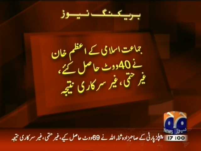 اپر دیر: حلقہ پی کے 93 کے ضمنی انتخاب، پولنگ اسٹیشن ہزارہ کا غیر سرکاری غیر ختمی نتیجہ، پیپلز پارٹی کے صاحبزادہ ثناء اللہ نے 69 ووٹ حاصل کیے، جماعت اسلامی کے اعظم خان نے 40 ووٹ حاصل کیے، غیر سرکاری غیر ختمی نتیجہ۔