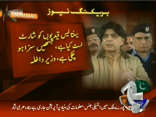 سینتالیس قیدیوں کو شارٹ لسٹ کیا گیا ہے، جنھیں سزا ہو چکی ہیں، شفقت حسین کی پھانسی پر عملدرآمد روک دیا گیا ہے، اس کی عمر طے کرنے کے لیے ڈی این اے ٹسٹ ہو گا، باقی پھانسیوں پر تیزی سے عملدرآمد ہو گا، وزیر داخلہ کا اعلان۔