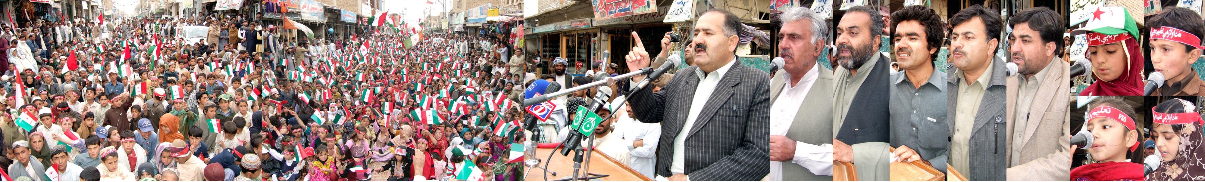 پشین : پشتونخواایس او کے زیر اہتمام تعلیمی مہم کے جلسے سے احمد جان خان سردار مصتفٰی خان ترین محمد عیٰسی روشناس کبیر افغان اور دیگر مقررین خطاب کر رہے ہیں۔
