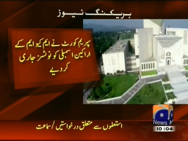 سپریم کورٹ کا پی ٹی آئی اور ایم کیو ایم کے استعفوں سے متعلق درخواستوں کو یکجا کرنے کا حکم، سپریم کورٹ نے ایم کیو ایم کے اراکین اسمبلی کو نوٹسز جاری کر دیئے۔