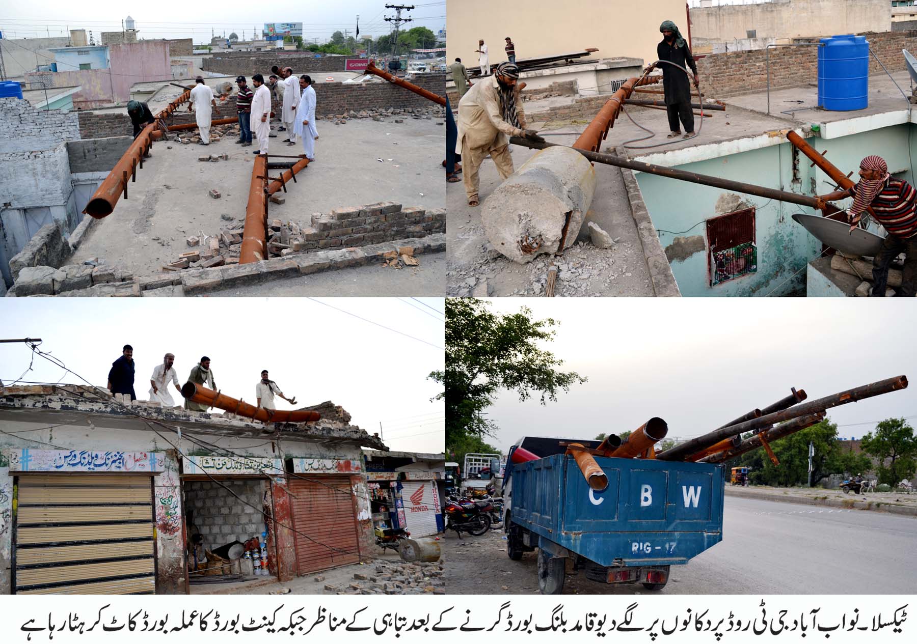ٹیکسلا (ڈاکٹر سید صابر علی سے) پنجاب کے دیگر شہروں کی طرح گزشتہ رات آنے والی طوفانی آدھی نے تباہی مچا دی متعدد تناور درخت زمین بوس ہوگئے واہ کینٹ ٹیکسلا میں طوفانی آندھی سے مواصلاتی نظام درہم برہم ہو گیا، روڈ کے کنارے پر لگے بڑے بڑے سائن بورڈ منہدم ہوگئے، نواب آباد جی ٹی روڈ پر دکانوں کی چھت پر لگا بڑا دیو قامد بلنگ بورڈ گرنے سے کئی دکانوں کے چھت کریک ہو گئے، جبکہ منسلک گھروں کو بھاری نقصان پہنچا ، بڑے دیو قامد بورڈ گرنے کے بعد کینٹ بورڈ واہ کینٹ کا عملہ حرکت میں آگیا،موقع پر پہنچ کر بورڈ بحق سرکار ضبط کرلیا گیا، کینٹ بورڈ کا موقف ہے کہ یہ بلنگ بورڈ غیر قانونی تھا قبل ازیں انھیں کینٹ بورڈ کی جانب سے نوٹس جاری کیا گیا تھا، بلنگ بورڈ کے اونر کے خلاف ایف آئی آر بھی درج کی جائے گی۔۔