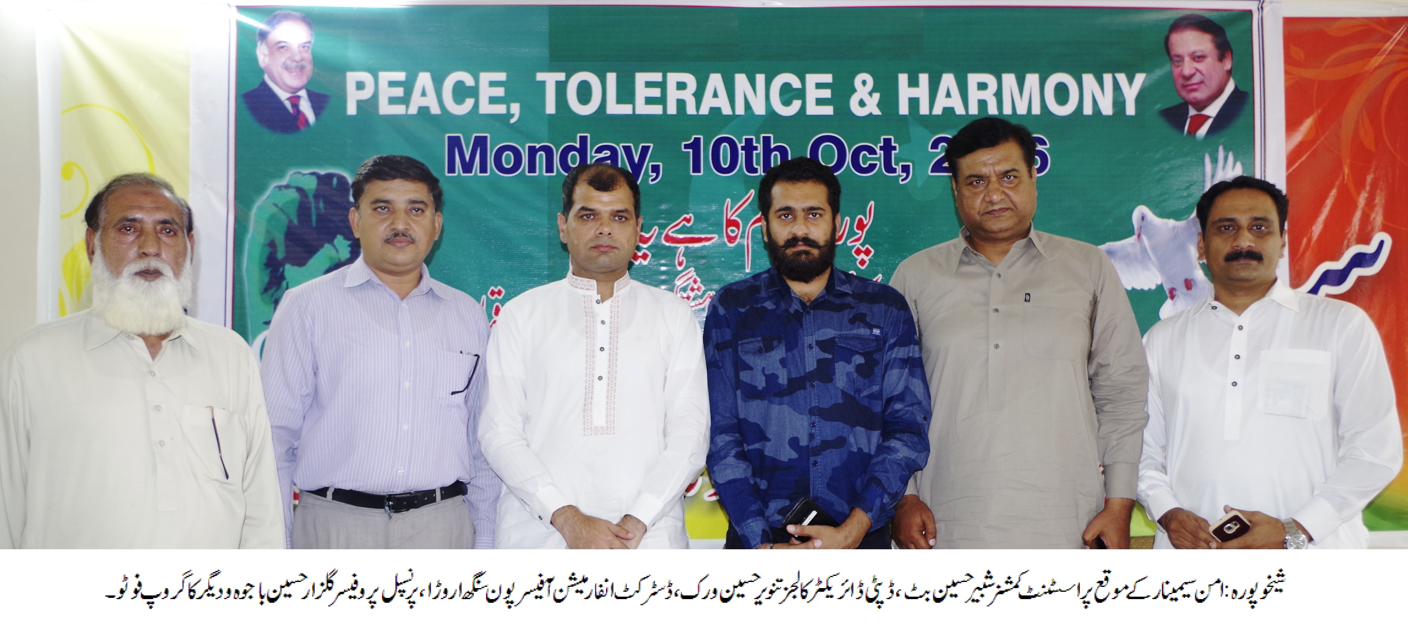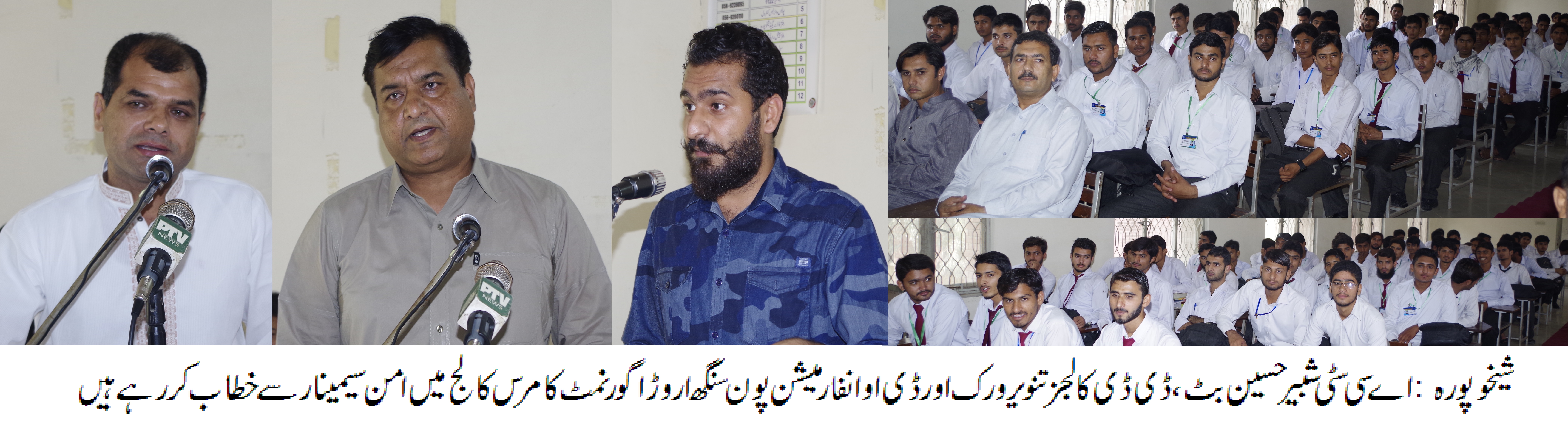 شیخوپورہ : پاکستان امن پسند ملک ہے اور یہاں کے باشندے کسی کا نقصان نہیںچاہتے آج وہ دور نہیں جس میں لوگ آپس میں لڑتے رہیں اور اپنا ہی نقصان کرتے رہیں ہمیں ضرورت اس چیز کی ہے مل جل کر اپنی فلاح کے لئے کام کریںاور وطن عزیز کو ترقی کی راہ پر گامزن کریں دنیا کا ہر مذہب امن اور بھائی چارے کا درس دیتا ہے اور امن میں ہی ہماری بقاء ہے ان خیالات کا اظہاراے سی سٹی شبیر حسین بٹ نے محکمہ تعلقات عامہ پنجاب، ڈسٹرکٹ انفارمیشن آفس شیخوپورہ کے زیر اہتمام گورنمنٹ کامرس کالج شیخوپورہ میں منعقدہ سیمینار سے خطاب کرتے ہوئے کیا۔اس موقع پر ڈپٹی ڈائریکٹر کالجزتنویر احمد ورک ،ڈسٹرکٹ انفارمیشن آفیسر پون سنگھ اڑوڑا،پرنسپل کامرس کالج پروفیسر گلزار حسین باجوہ،پروفیسر رانا محمد اشفاق،پروفیسر ذولفقار علی ورک،پروفیسر صابر حسین بخاری،پروفیسر محمد علی موجود تھے جبکہ تلاوت قرآن پاک حافظ محمد اشفاق،نعت سید حماد علی اور مقررین میں حافظ محمد زمان،احسان الٰہی شامل تھے ان کے ساتھ ساتھ وکلاء برادری اور سینئیر صحافیوں سمیت طلباء کی کثیر تعداد موجود تھی۔ ڈپٹی ڈائریکٹر کالجز تنویر احمدورک نے خطاب کرتے ہوئے کہا کہ انسانیت کا تقاضا یہ ہے کہ ہم ایک دوسرے کو برداشت کرتے ہوئے امن کا مظاہرہ کریں اور سب سے پہلے انسانیت کے زندہ ہونے کو ثبوت دیں ۔ اس موقع پرڈسٹرکٹ انفارمیشن آفیسرپو ن سنگھ اڑوڑاکا کہنا تھا کہ امن اور برداشت در حقیقت ہمارے رویوں میں تبدیلی کا نام ہے جس کی موجودہ وقت میں اشد ضرورت ہے ان دونوں کے ساتھ ساتھ اپنے اختلافات کو مٹا کر انسانیت سے محبت کا ثبوت دینے کے نتیجے میں ہم وطن عزیز کو خوب سے خوب تر بنانے میں اپنا اہم کردار ادا کر سکتے ہیں۔۔امن کے موضو ع پر گورنمنٹ کامرس کالج شیخوپورہ کے طلبا کے درمیان اردو تقاریر مقابلہ کروایاگیا جس میں طلباء نے اپنے خیالات کا باخوبی نقشہ کھینچا جبکہ طلباء کو بتایا گیاکہ ہمیں اپنے اپنے اختلافات کو ختم کر کے امن ،برداشت او ر ہم آہنگی کا مظاہرہ کر کے اپنے ملک کو ترقی کی راہ پر گامزن کر سکتے ہیں۔ کالج انتظامیہ اور طلباء نے تقریب کے انعقاد پر خوشی کا اظہار کیا۔