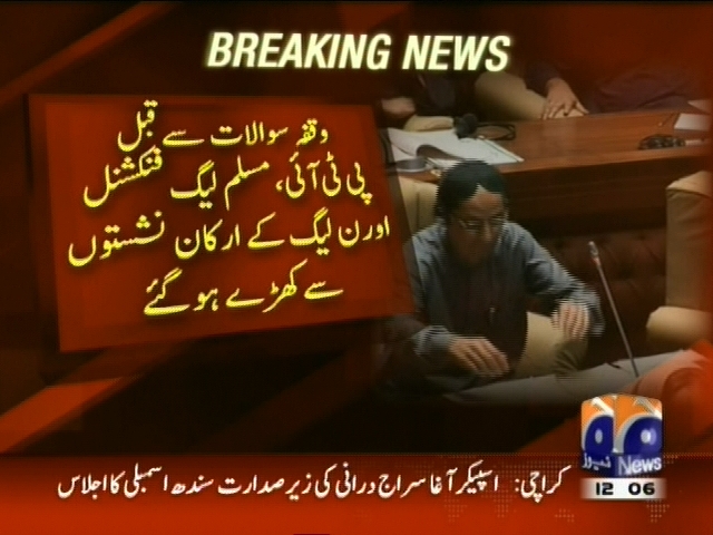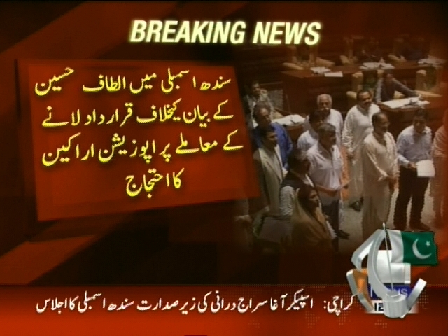 سندھ اسمبلی میں الطاف حسین کے بیان کیخلاف قرارداد لانے کے معاملے پر اپوزیشن اراکین کا احتجاج، وقفہ سوالات سے قبل پی ٹی آئی، مسلم لیگ فنکشنل اور ن لیگ کے ارکان نشستوں سے کھڑے ہو گئے، قرارداد پیش کرنے کی اجازت نہ ملنے پر اپوزیشن ارکان واک آؤٹ کر گئے۔