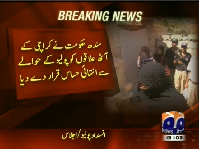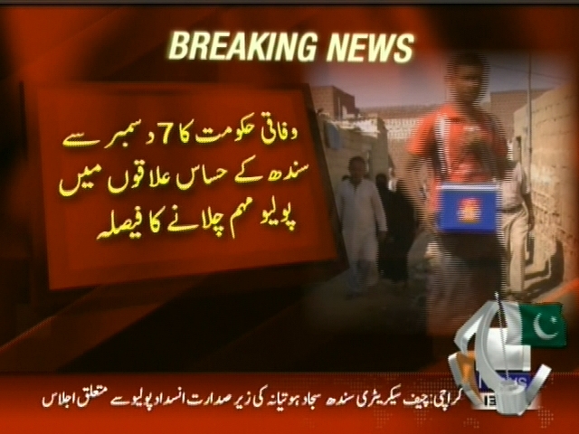 سندھ حکومت نے کراچی کے آٹھ علاقوں کو پولیو کے حوالے سے انتہائی حساس قرار دے دیا۔ وفاقی حکومت کا 7 دسمبر سے سندھ کے حساس علاقوں میں پولیو مہم چلانے کا فیصلہ۔ پولیو مہم میں سیکیورٹی کیلیے رینجرز کی خدمات حاصل کر نے کا فیصلہ۔