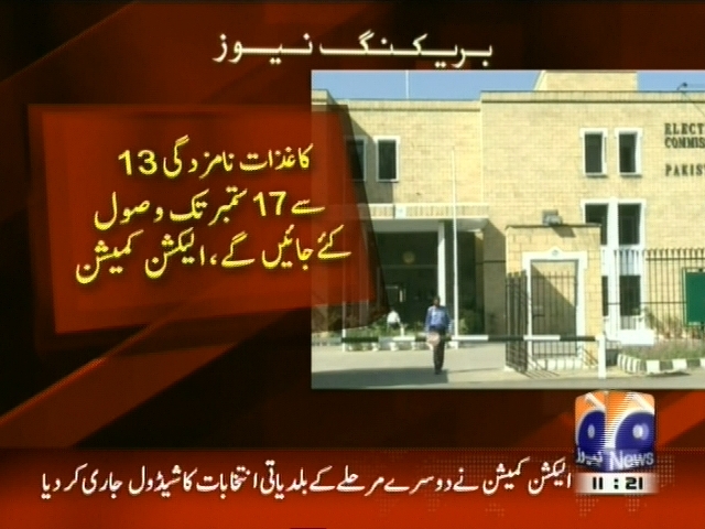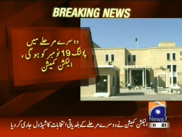 سندھ اور پنجاب میں بلدیاتی انتخابات کے دوسرے مرحلے کا شیڈول جاری، دوسرے مرحلے میں پولنگ 19 نومبر کو ہو گی، کاغذات نامزدگی 13 سے 17 ستمبر تک وصول کئے جائیں گے، الیکشن کمیشن۔