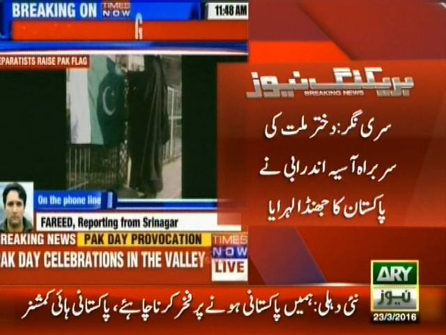 سری نگر : یوم پاکستان پروادی کے پاکستان نعروں سے گونج اٹھی ، سری نگر: دختر ملت سربراہ آسیہ اندرابی نے پاکستان کا جھنڈا لہرایا۔