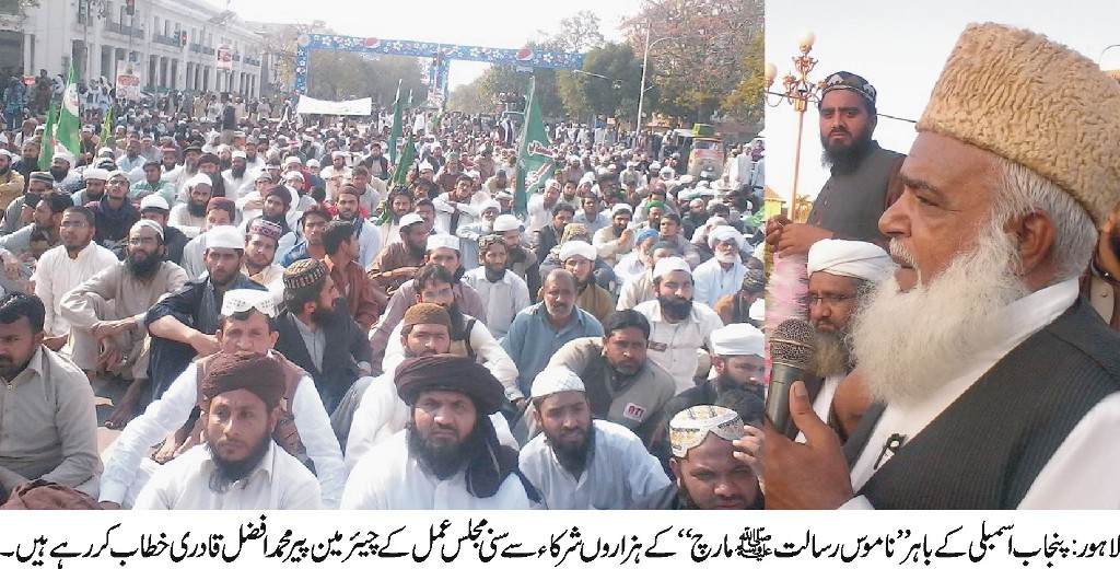 لاہور : لائوڈ سپیکر ایکٹ کی آڑ میں علماء کی گرفتاریاں کرکے ناجائز مقدمے بنانے، مساجد سے لائوڈ سپیکر اترواکر اذان کی آواز کو محدود کرنے اورناموس رسالت صلی اللہ علیہ وآلہ وسلم کے قانون میں غیر ملکی مداخلت پر سنی مجلس عمل کے زیر اہتمام داتا دربار سے پنجاب اسمبلی تک عظیم الشان ”ناموس رسالت صلی اللہ علیہ وآلہ وسلم مارچ” کیا گیا، ہزاروں غلامان رسول نے شرکت کی۔ مقررین میں سنی مجلس عمل کے چیئرمین پیر محمد افضل قادری، شیخ الحدیث علامہ خادم حسین رضوی، ڈاکٹر اشرف آصف جلالی، سید مختار رضوی، پیر مصطفی اشرف، پیر سید علی ذوالقرنین نقوی، مولانا محمد ضیاء اللہ قادری، پیر میاں تنویر احمد، ڈاکٹر محمد عارف نعیمی، علامہ نصر اللہ خاں، صاحبزادہ ذکاء اللہ رضوی، پیر سید عبد الغفار شاہ، پیر سید خرم ریاض، مولانا محمد اعجاز اشرفی، مولانا غلام ربانی اور دیگر شامل تھے۔