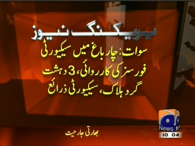 سوات : چار باغ میں سیکیورٹی فورسز کی کارروائی 3 دہشت گرد ہلاک، سیکیورٹی زرائع۔ گزشتہ رات نامعلوم افراد نے امن کمیٹی کے رکن کو اتل کر دیا تھا، سیکیورٹی زرائع۔