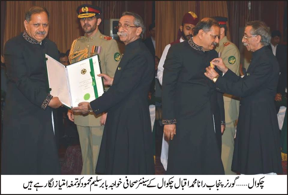 تلہ گنگ (تحصیل رپورٹر) سینئر صحافی اور چیئرمین چکوال پریس کلب خواجہ بابر سلیم محمود کی صحافتی خدمات کے اعتراف میں اسلامی جمہوریہ پاکستان کے صدر کی طرف سے اعلان کیا جانے والا تمغہ امتیاز گورنر ہائوس کے دربار ہا ل میں گورنر پنجاب رانا محمد اقبال نے خواجہ بابر سلیم محمود کو پہنچایا۔ ضلع چکوال کی تاریخ میں یہ پہلا تمغہ امتیاز ہے جو کسی بھی علاقائی صحافی یا کسی دیگر شعبہ میں دیا گیا ہے۔ صدر پاکستان ممنون حسین نے14اگست2014کو یوم آزادی کے موقع پر مختلف شعبوں میں نمایاں کارکردگی دکھانے والے 176افراد کیلئے ستارہ امتیاز ، تمغہ امتیاز، تمغہ حسن کارکردگی دینے کا اعلان کیا تھا، گورنر ہائوس لاہور میں 35افراد کو یہ تمغے دیے گئے، ستارہ امتیاز اور تمغہ حسن کارکردگی خوش نصیبوں کے گلے میں پہنایا گیا جبکہ تمغہ امتیاز خوش نصیبوں کے سینوں پر لگایا گیا۔ اس موقع پر مشیر وزیراعلیٰ پنجاب رانا مقبول احمد، مشیر وزیراعلیٰ پنجاب بیگم زکیہ شاہ نواز، سول افسران بھی موجود تھے۔جبکہ سٹیج سیکرٹری کے فرائض ایڈیشنل سیکرٹری پنجاب نے سرانجام دیئے۔ تقریب 6:55بجے شام کو شروع ہوئی اور پورے آٹھ بجے اختتام پذیر ہوئی ، خواجہ بابر سلیم محمود کو تمغہ امتیاز دیتے وقت بتایا گیا کہ خواجہ بابر سلیم محمود چکوال میں جنگ گروپ آف نیوز پیپرز کے نمائندے ہیں اور چکوال پریس کلب کے بانی ممبران ہیں اور اب وہ چیئرمین چکوال پریس کلب ہیں۔ خواجہ بابر سلیم محمود نے پورے علاقے میں اخبارات کی ترویج اور ادبی ماحول پیدا کرنے میں گراں قدر خدمات سرانجام دی ہیں اور خصوصی طور پر مقامی اخبارات کے ذریعے علاقے کے مسائل اور علاقے کے آثار قدیمہ کو فروغ دیا ، جس کے نتیجہ میں چکوال اس وقت نا صرف پنجاب بلکہ پورے پاکستان کا ایک نمایاں ضلع بن کر سامنے آیا ہے۔