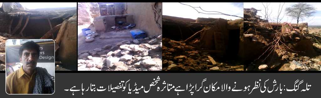 تلہ گنگ (تحصیل رپو رٹر) کو ٹٹیرہ کے رہائشی کا گھر بارش کی نظر ،رہا ئشی فیملی کے ہمر اہ پڑ وسی کے گھر رہنے پر مجبور ،حکو مت پنجاب سے متا ثر ہ شخص کی مدد کر نے کی اپیل۔ تفصیل کے مطابق کو ٹٹیرہ کے رہا ئشی محمد اصف اقبال نامی شخص نے میڈ یا کو بتایا ہے کہ میں نے سر چھا پنے کیلئے چار مکان تعمیر ہو ئے کیے ہو ئے تھے جو گزشتہ تیز بارشوں کی وجہ سے تمام مکان گر ا کر تبا ہ ہو گئے ہیں اور میر ی جمع شدہ پو نجی سے بنا یا ہوا سا ما ن بھی ملبے کے نیچے پڑا ہے۔میں نے بچوں کے سا تھ ایک پڑوسی کے کمر ے میں رہا ئش پذ یر ہو ں۔پہلے بھی میں بڑ ے مشکل سے اپنے بچوں کا پیٹ پا ل رہا تھا اور اب میر ے پا س مکا ن تعمیر کر نے کیلئے پیسے نہیں ہیں ۔میں حکو مت پنجا ب ، منتخب نما ئندوں اور مخیر حضرات سے درمندانہ اپیل کر تا ہوں کہ میر ی مد د کی جا ئے تا کہ میں دوبا رہ مکا ن تعمیر کر کے زند گی ا سانی سے بسر کر سکو ں۔