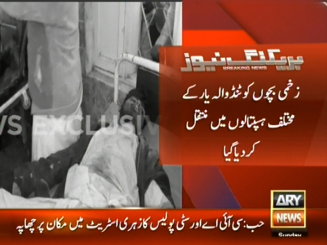 ٹنڈوالہ یار قلعہ چوک پر غباروں میں ہوا بھرنے والے سلنڈر میں دھماکہ، غبارے خریدنے والی دو بچیاں جاں بحق، نو بچوں سمیت 11 شدید زخمی، دھماکہ کے باعث موقع پر کھڑی موٹر سائیکل مکمل طور پر تباہ، زخمی بچوں کو ٹنڈو والہ یار کے مختلف ہسپتالوں میں منتقل کر دیا گیا۔