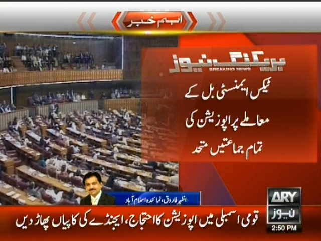 ٹیکس ایمنسٹی بل کے معاملے پر اپوزیشن کی تمام جماعتیں متحد، قومی اسمبلی میں اپوزیشن کا احتجاج، ایجنڈے کی کاپیاں پھاڑ دیں۔