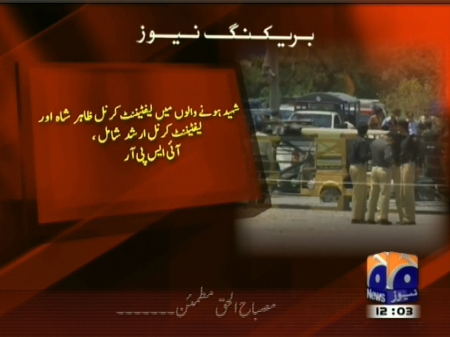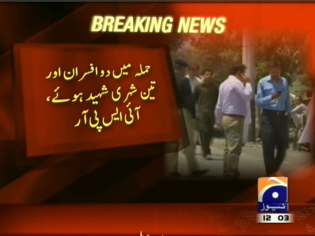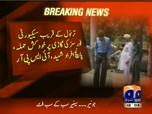 ترنول کے قریب سیکیورٹی فورسز کی گاڑی پر خودکش حملہ پانچ افراد شہید، آئی ایس پی آْر۔ حملہ میں دو افسران اور تین شہری شہید ہوئے، آئی ایس پی آر۔ خودکش حملہ صبح نو بج کر بیس منٹ پر کیا گیا، ترجمان پاک فوج۔