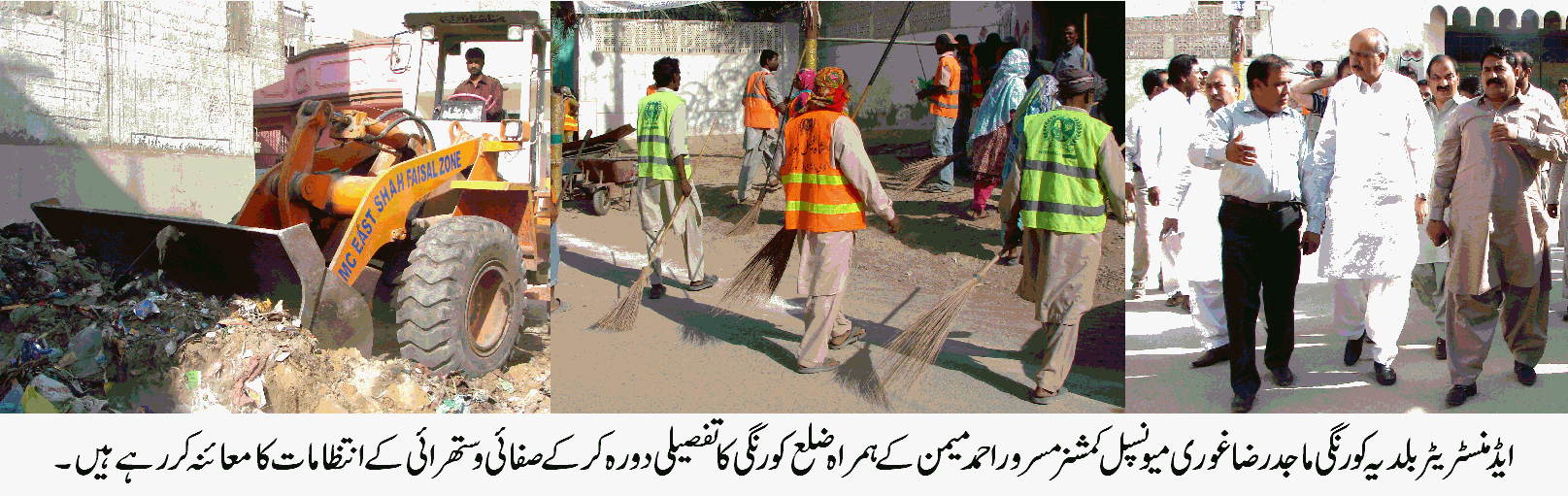 ان خیالات کا اظہار ایڈمنسٹریٹر ماجد رضا غوری نے میونسپل کمشنر مسرور احمد میمن کے ہمراہ شاہ فیصل ،کورنگی اور لانڈھی زون کا تفصیلی دورہ کرکے صفائی وستھرائی سمیت دیگر بلدیاتی سہولیات کی فراہمی کے حوالے سے جاری انتظامات کا معائنہ کرتے ہوئے کیا اس موقع پر بلدیہ کورنگی کے تمام محکماجاتی افسران اور تمام زونز کے فوکل پرسن بھی موجود تھے۔
